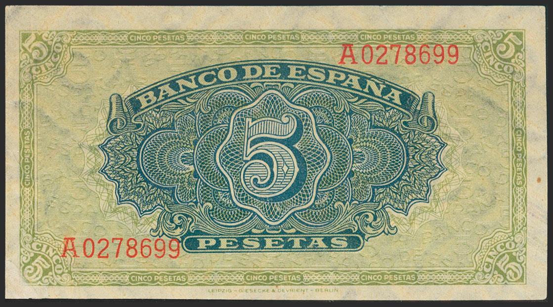5 Pesetas. 4 de Septiembre de 1940. Serie A. (Edifil 2021: 443). Apresto original. SC-.