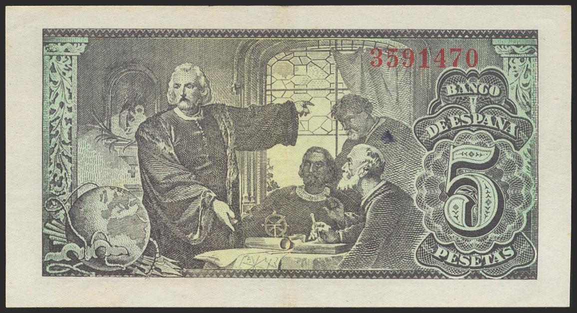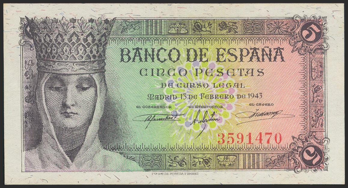 5 Pesetas. 13 de Febrero de 1943. Sin serie. (Edifil 2021: 446). Conserva gran parte del apresto original. EBC+.