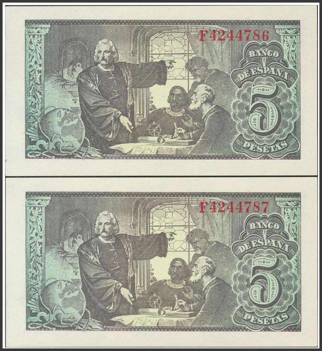 5 Pesetas. 13 de Febrero de 1943. Pareja correlativa. Serie F. (Edifil 2017: 446a). Apresto original. SC.