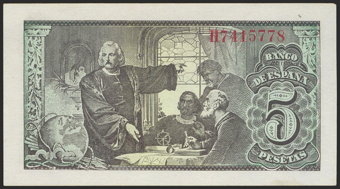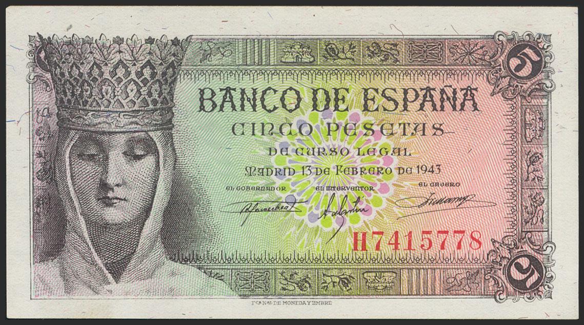 5 Pesetas. 13 de Febrero de 1943. Serie H. (Edifil 2021: 446a). Apresto original. SC.