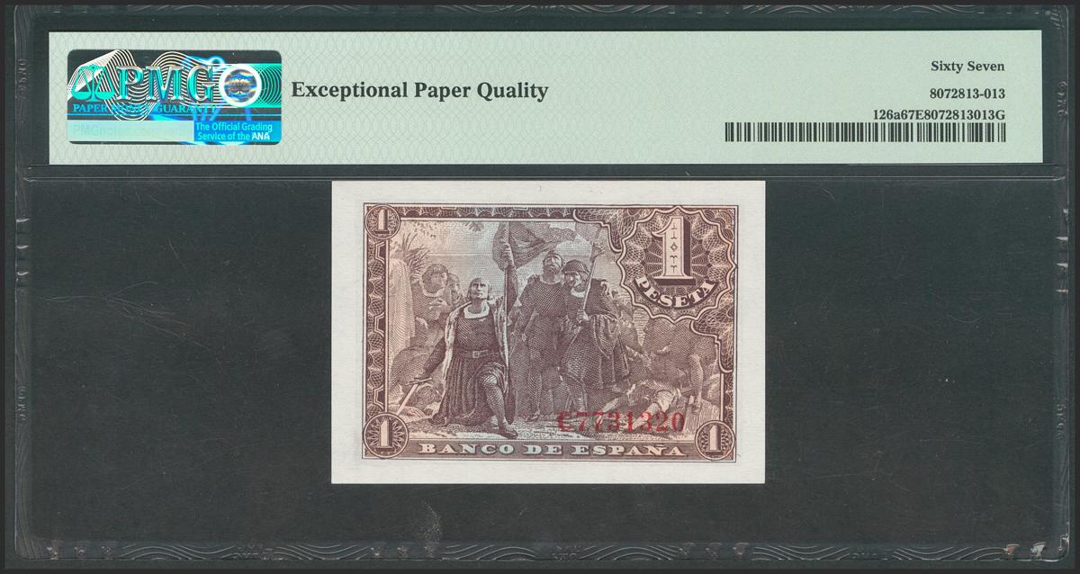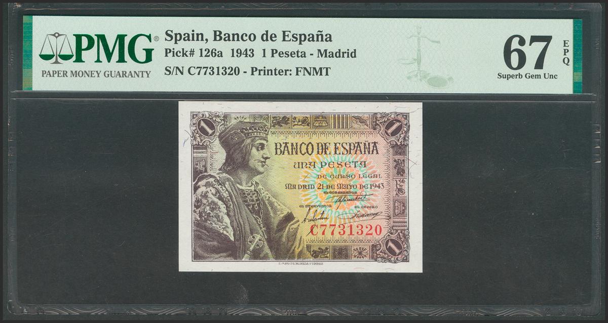 1 Peseta. 21 de Mayo de 1943. Serie C. (Edifil 2021: 447a). Inusual en esta calidad, apresto original. SC. Encapsulado PMG67EPQ.