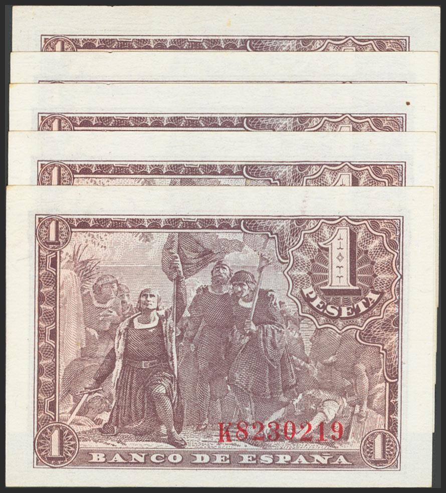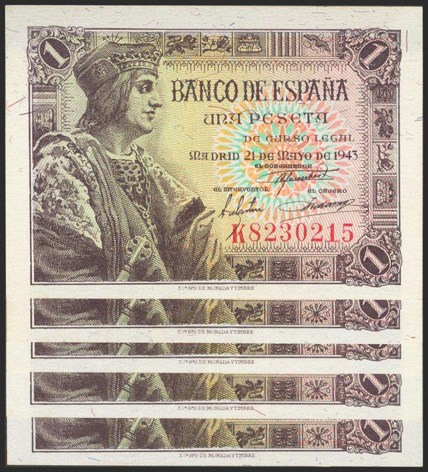 Conjunto de 5 billetes correlativos de 1 Peseta emitidos el 21 de Mayo de 1943 con la serie K. (Edifil 2017: 447a). SC/SC-.