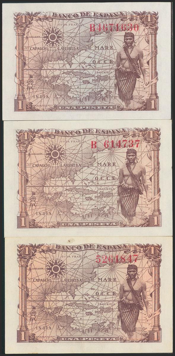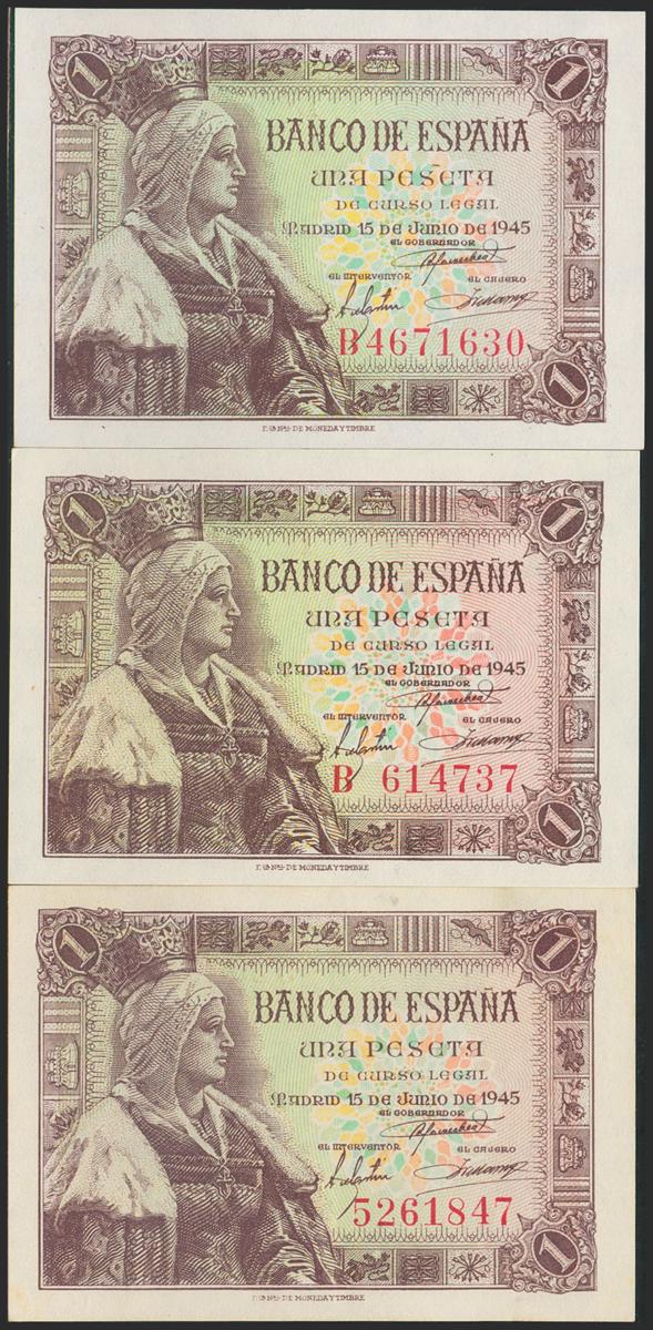 Conjunto de 3 billetes de 1 Peseta emitidos el 15 de Junio de 1945, sin serie y con la serie B(2). (Edifil 2021: 448, 448a). Apresto original. EBC+(el sin serie)/SC.