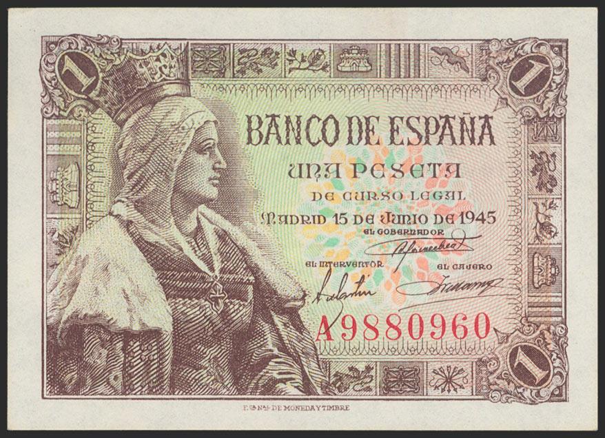 1 Peseta. 15 de Junio de 1945. Serie A. (Edifil 2021: 448a). Apresto original. SC.