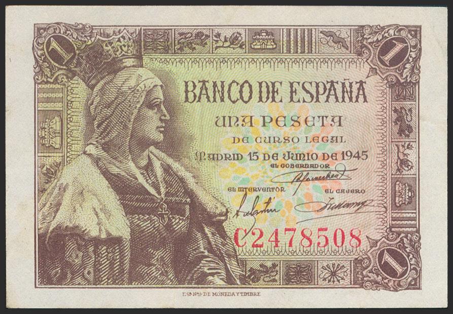 1 Peseta. 15 de Junio de 1945. Serie C. (Edifil 2021: 448a). Conserva gran parte del apresto original. EBC+.