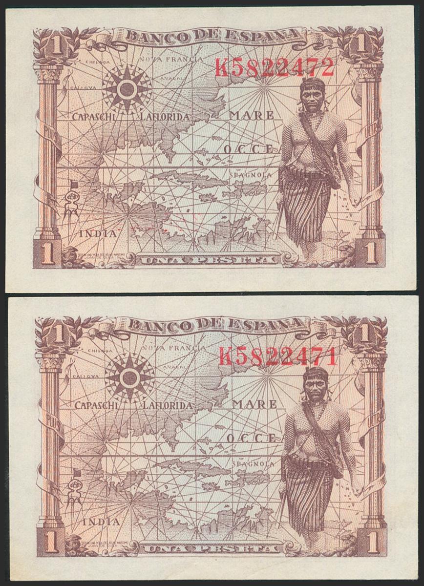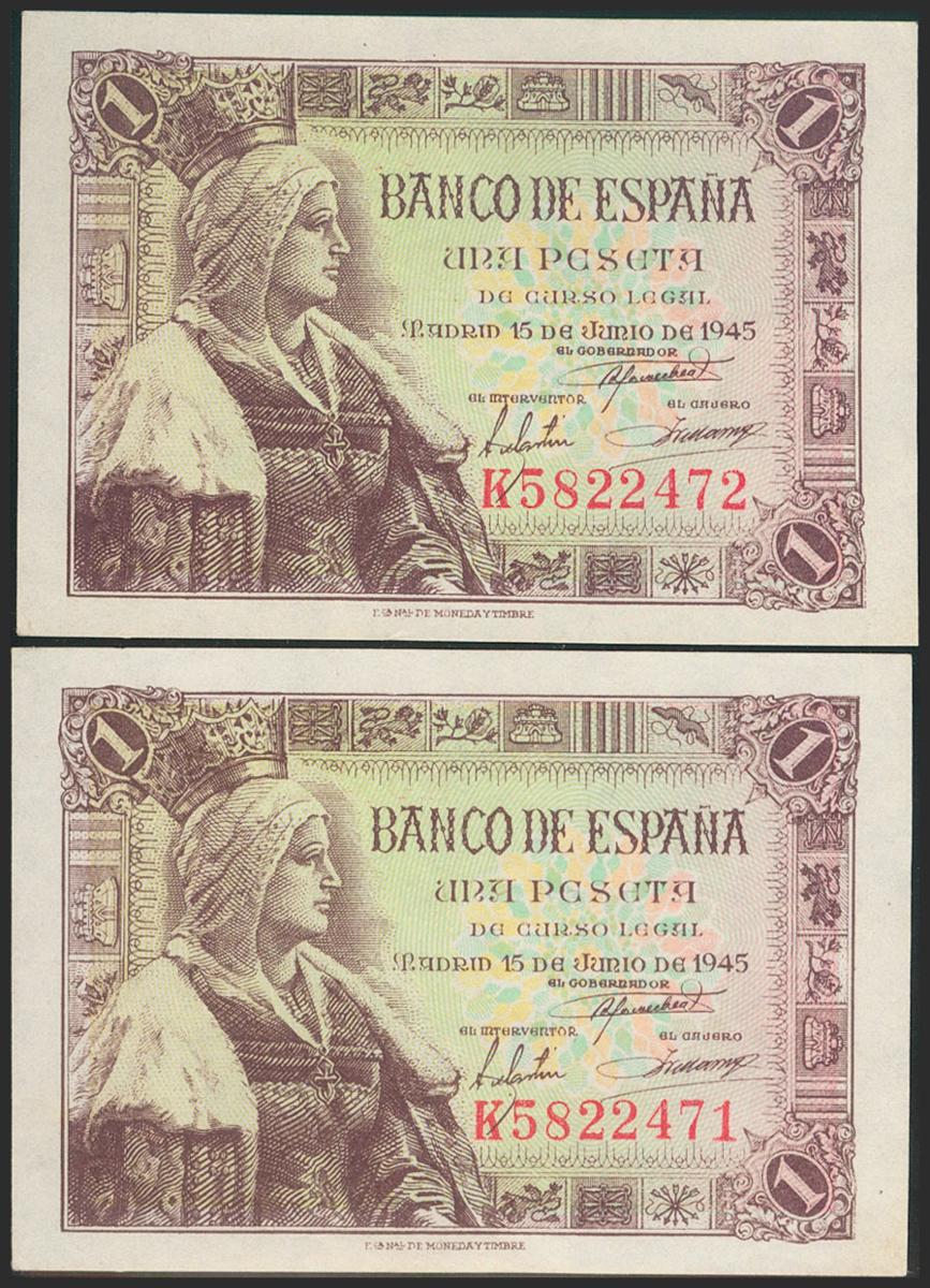1 Peseta. 15 de Junio de 1945. Pareja correlativa. Serie K. (Edifil 2021: 448a). Apresto original. SC-.