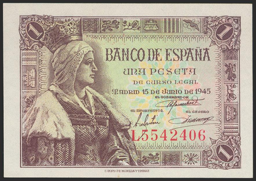 1 Peseta. 15 de Junio de 1945. Serie L. (Edifil 2021: 448a). Apresto original. SC-.
