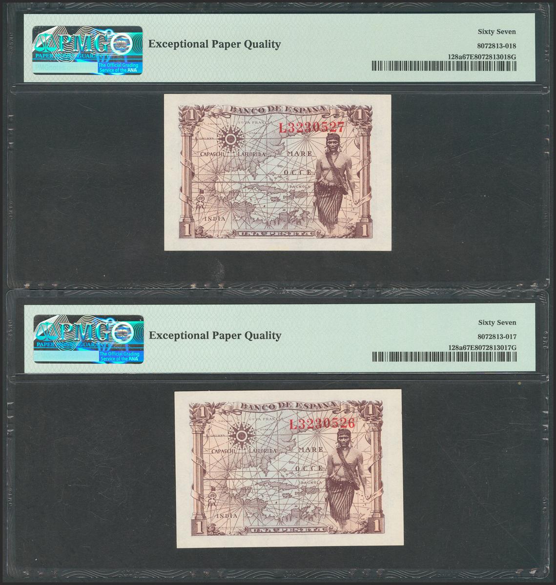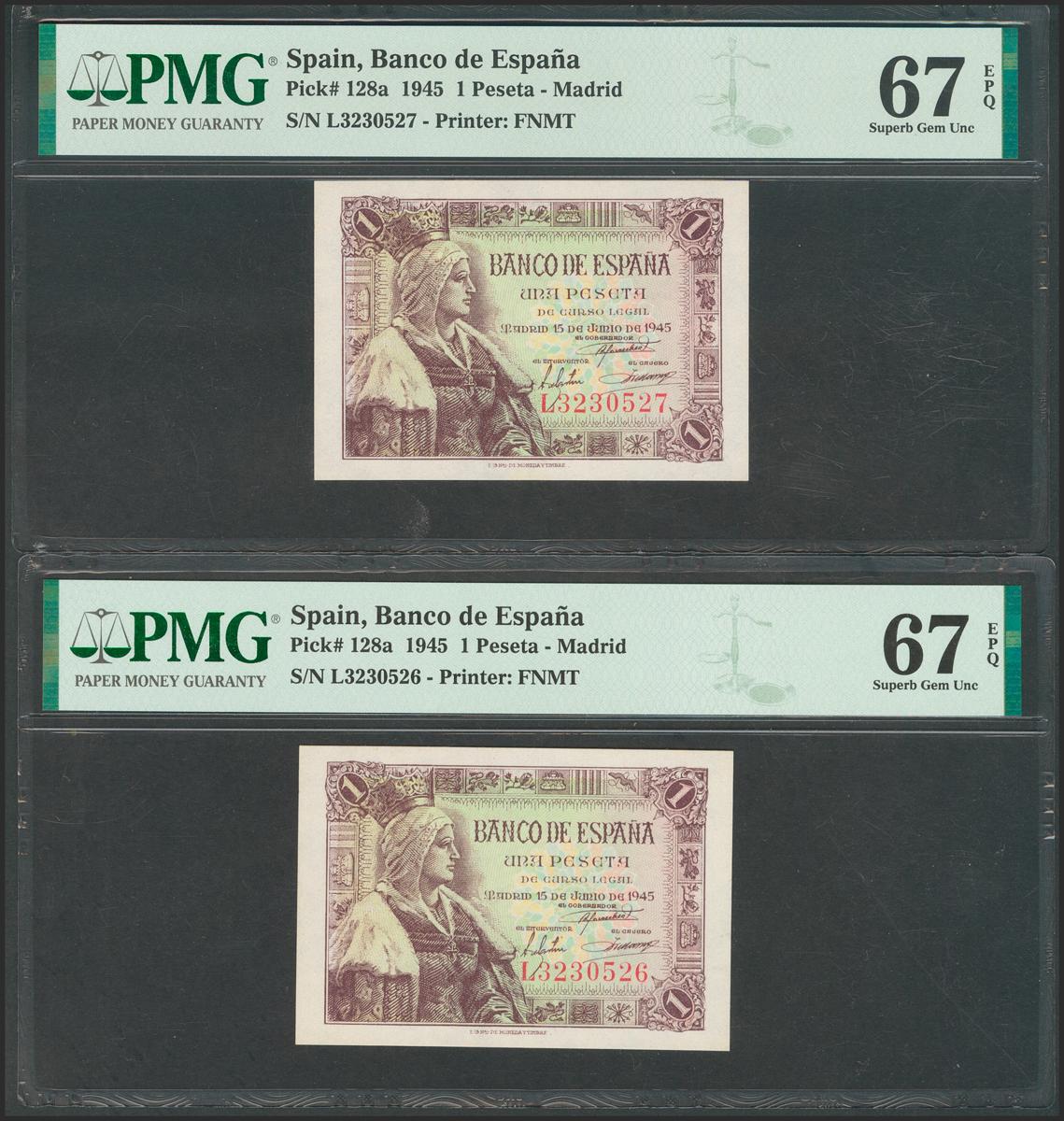 1 Peseta. 15 de Junio de 1945. Pareja correlativa. Serie L. (Edifil 2021: 448a). Apresto original. SC. Encapsulados PMG67EPQ, ambos.