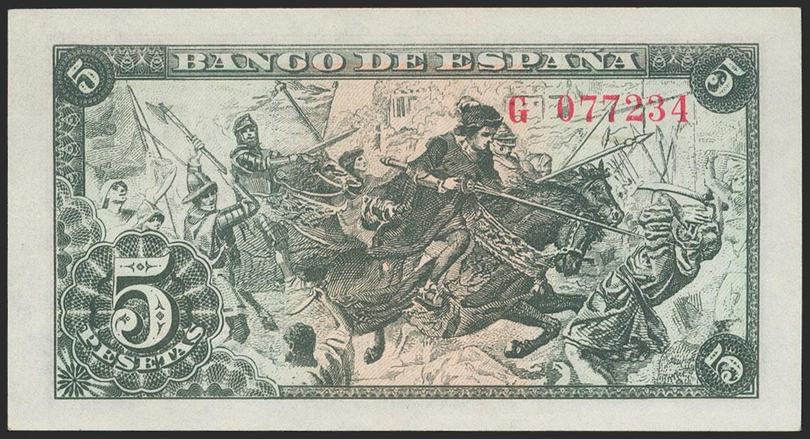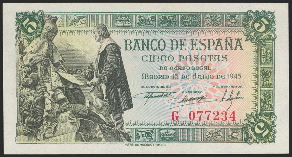 5 Pesetas. 15 de Junio de 1945. Serie G. (Edifil 2021: 449a). Conserva gran parte del apresto original. EBC+.