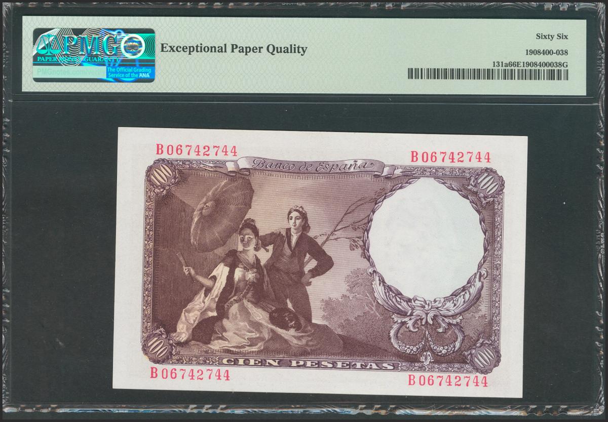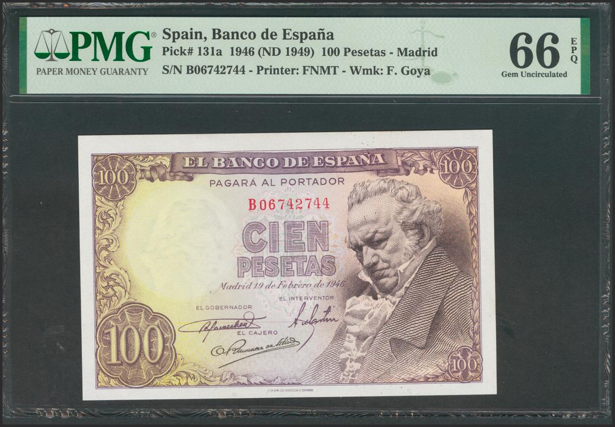 100 Pesetas. 19 de Febrero de 1946. Serie B. (Edifil 2017: 451b). Apresto original. SC. Encapsulado PMG66EPQ.