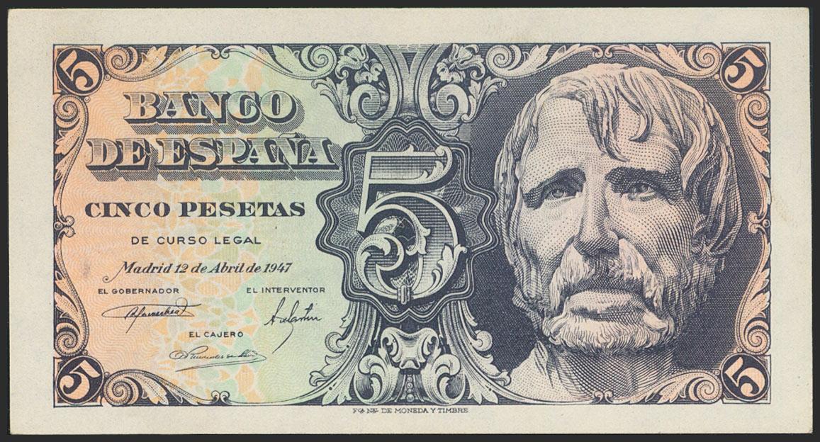 5 Pesetas. 12 de Abril de 1947. Serie A. (Edifil 2021: 454a). Apresto original. SC-.