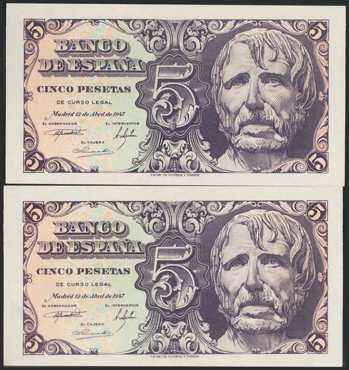 5 Pesetas. 12 de Abril de 1947. Pareja correlativa. Serie B. (Edifil 2021: 454a). Apresto original. SC.