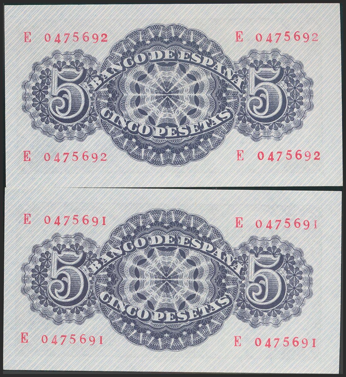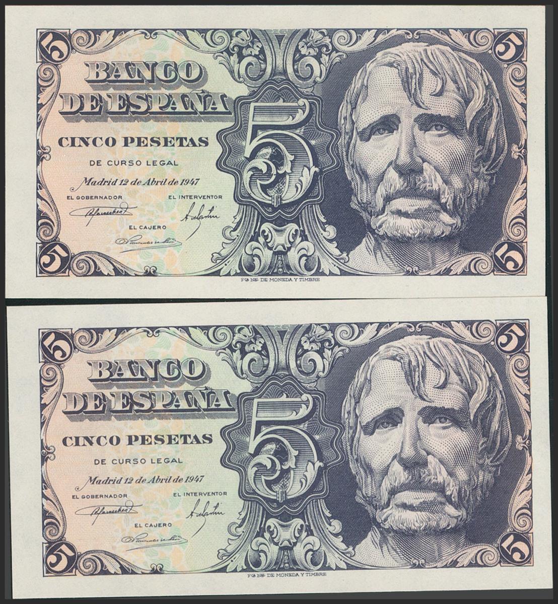 5 Pesetas. 12 de Abril de 1947. Pareja correlativa. Serie E, última serie emitida. (Edifil 2021: 454a). Apresto original. SC.