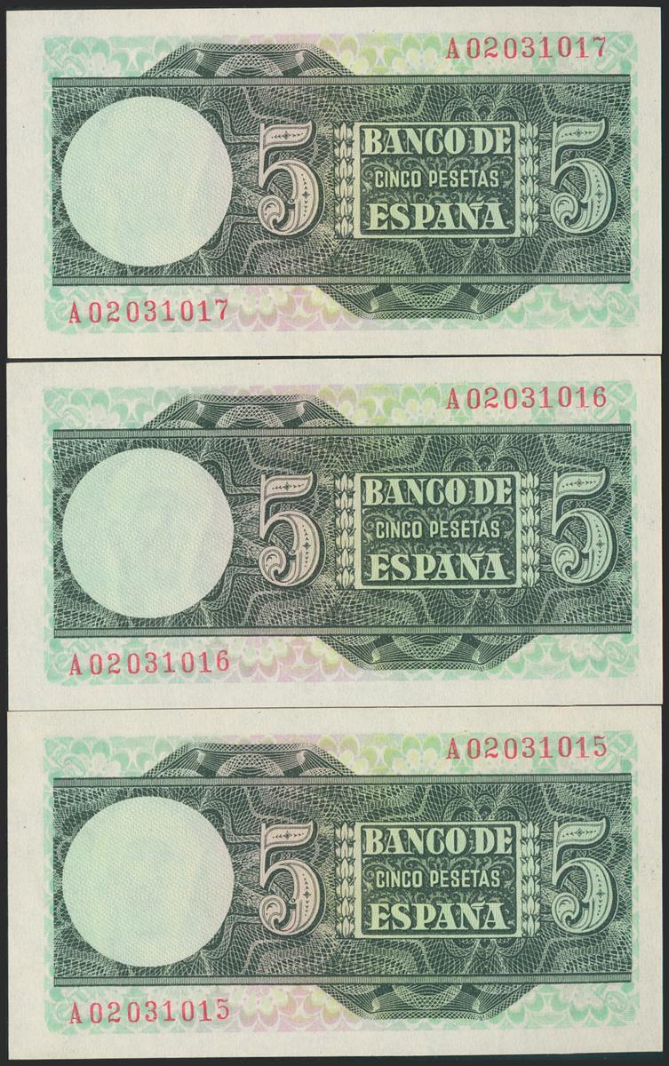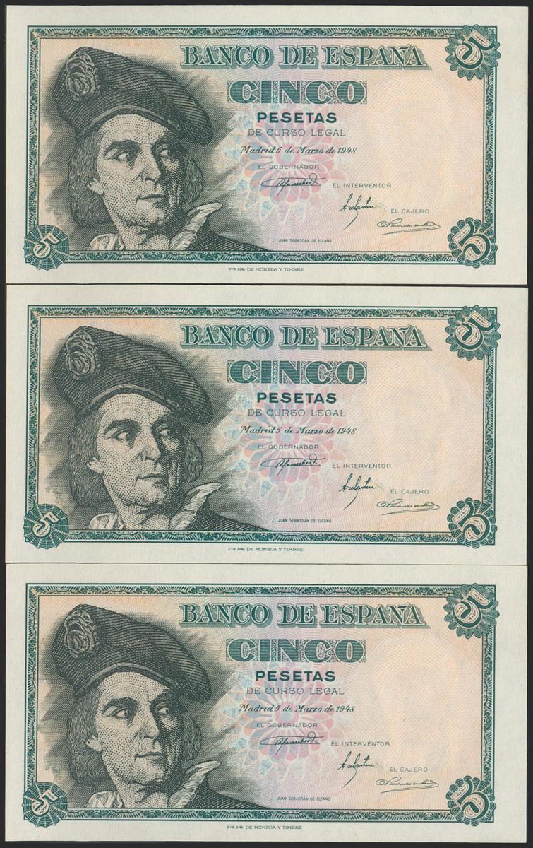 5 Pesetas. 15 de Marzo de 1948. Trío correlativo. Serie A. (Edifil 2021: 455a). Apresto original. SC.