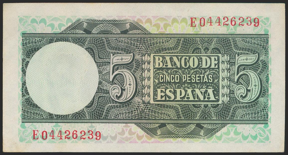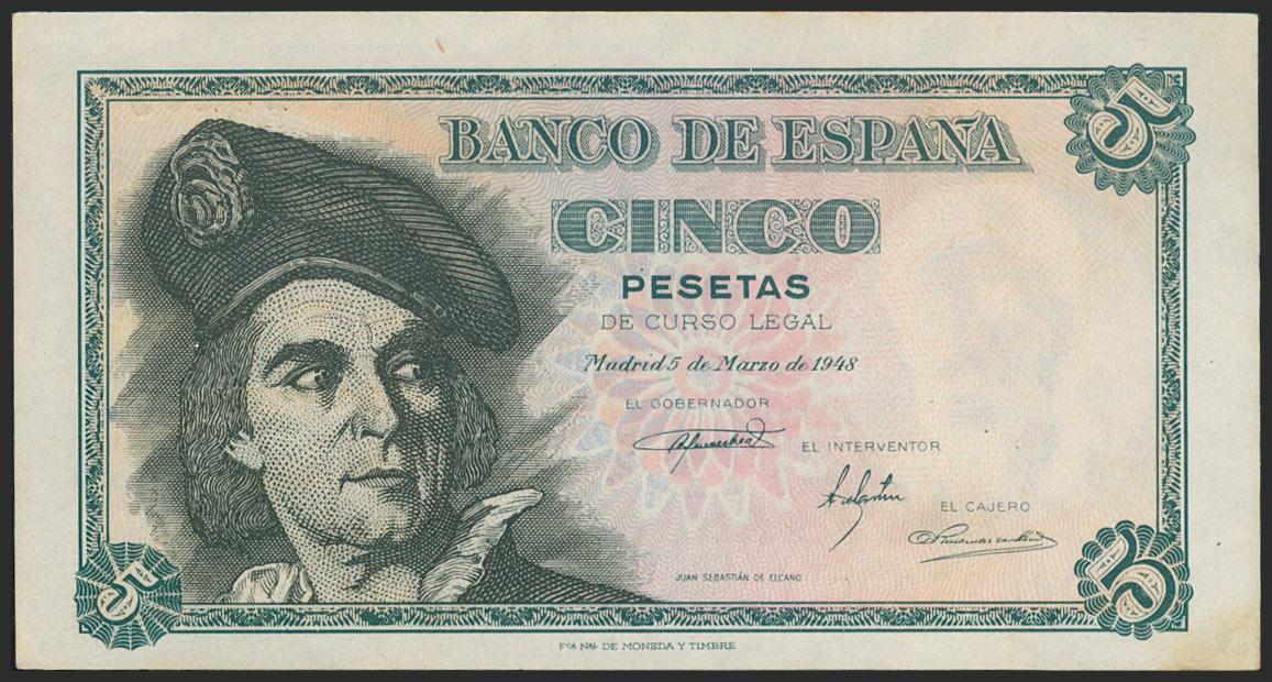 5 Pesetas. 15 de Marzo de 1948. Serie E. (Edifil 2021: 455a). Conserva gran parte del apresto original. EBC+.