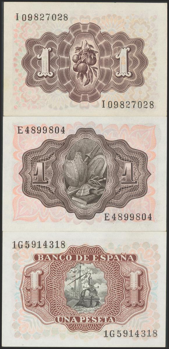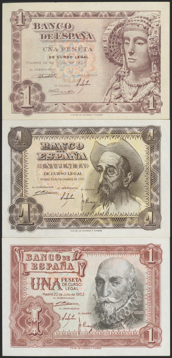 Conjunto de 3 billetes de 1 Peseta emitidos el 19 de Junio de 1948, 19 de Noviembre de 1951 y 22 de Julio de 1953 con las series I, E y 1G, respectivamente (Edifil 2017: 457a, 461a y 465a). SC/SC-.