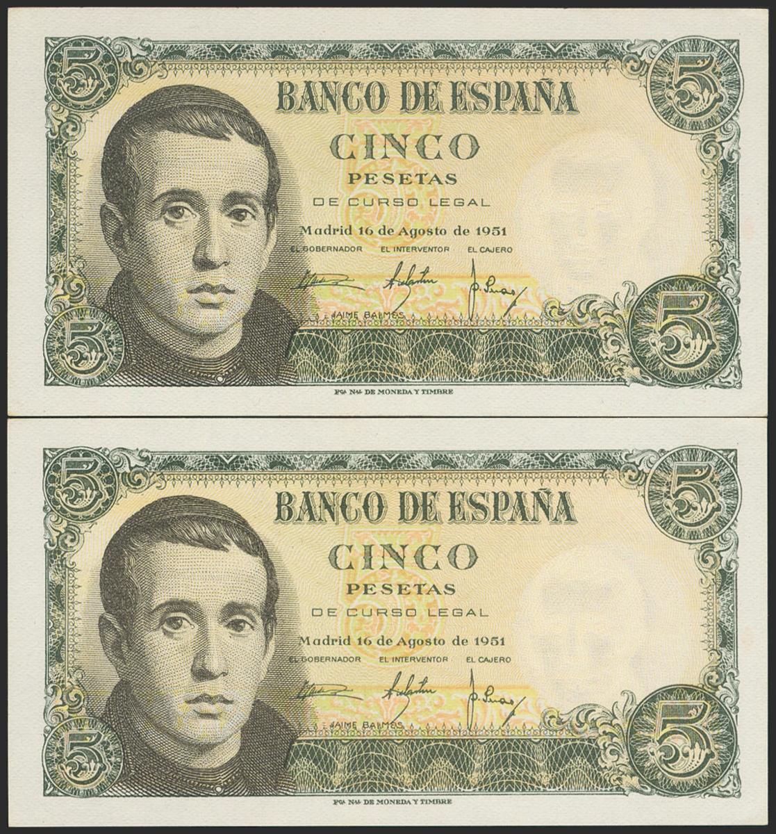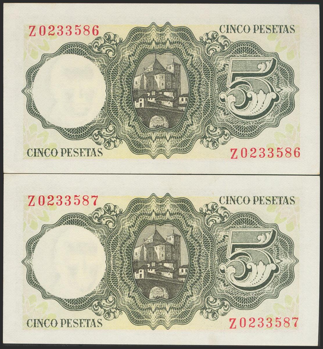 5 Pesetas. 16 de Agosto de 1951. Pareja correlativa. Serie Z. (Edifil 2021: 459a). Apresto original. SC.
