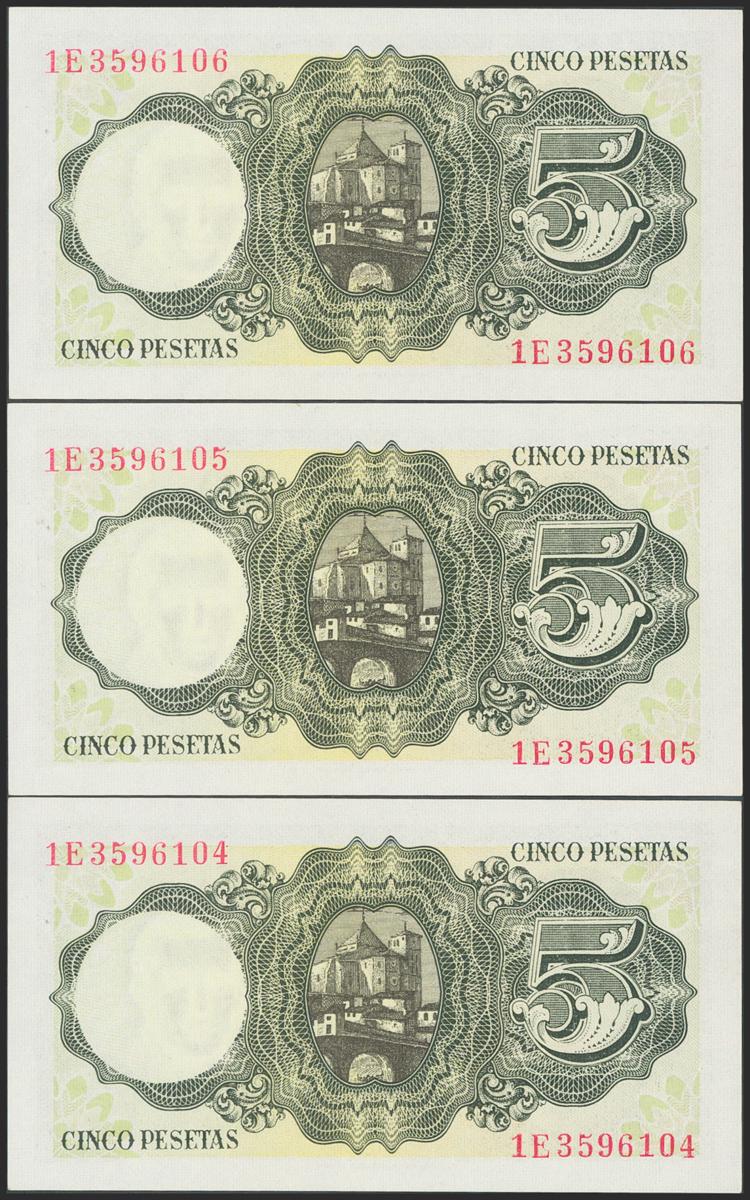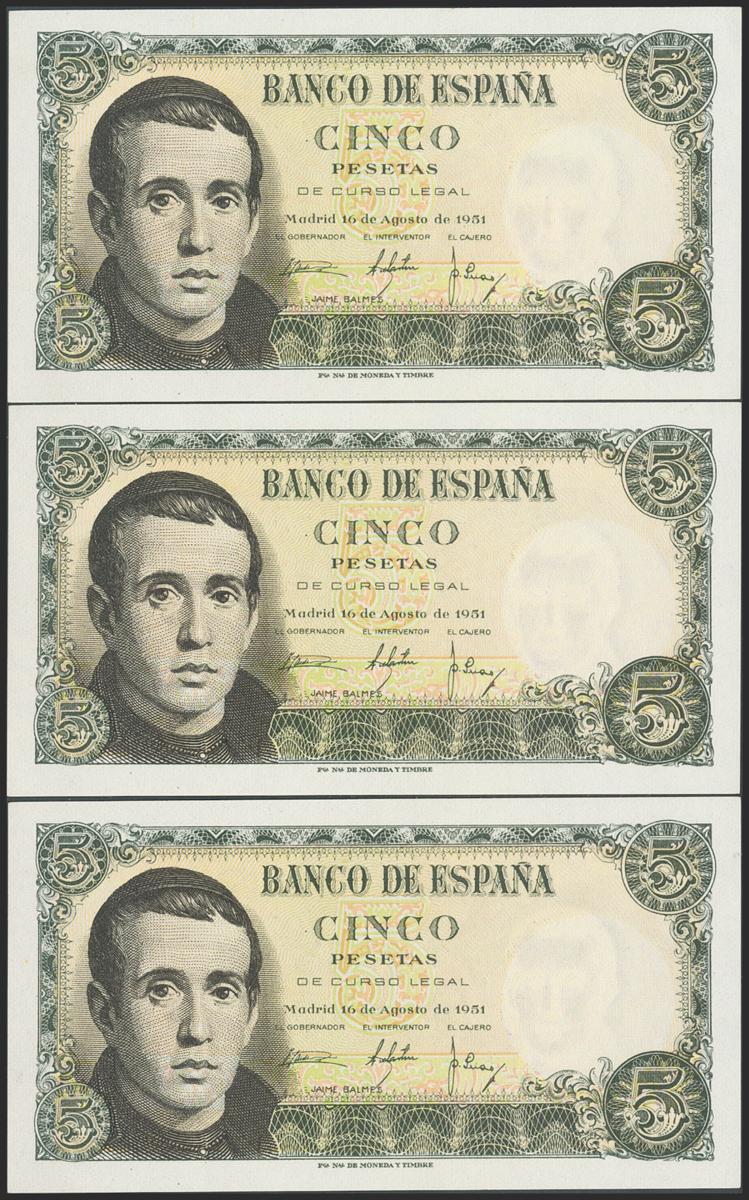 5 Pesetas. 16 de Agosto de 1951. Trío correlativo. Serie 1E. (Edifil 2021: 459a). Apresto original. SC.