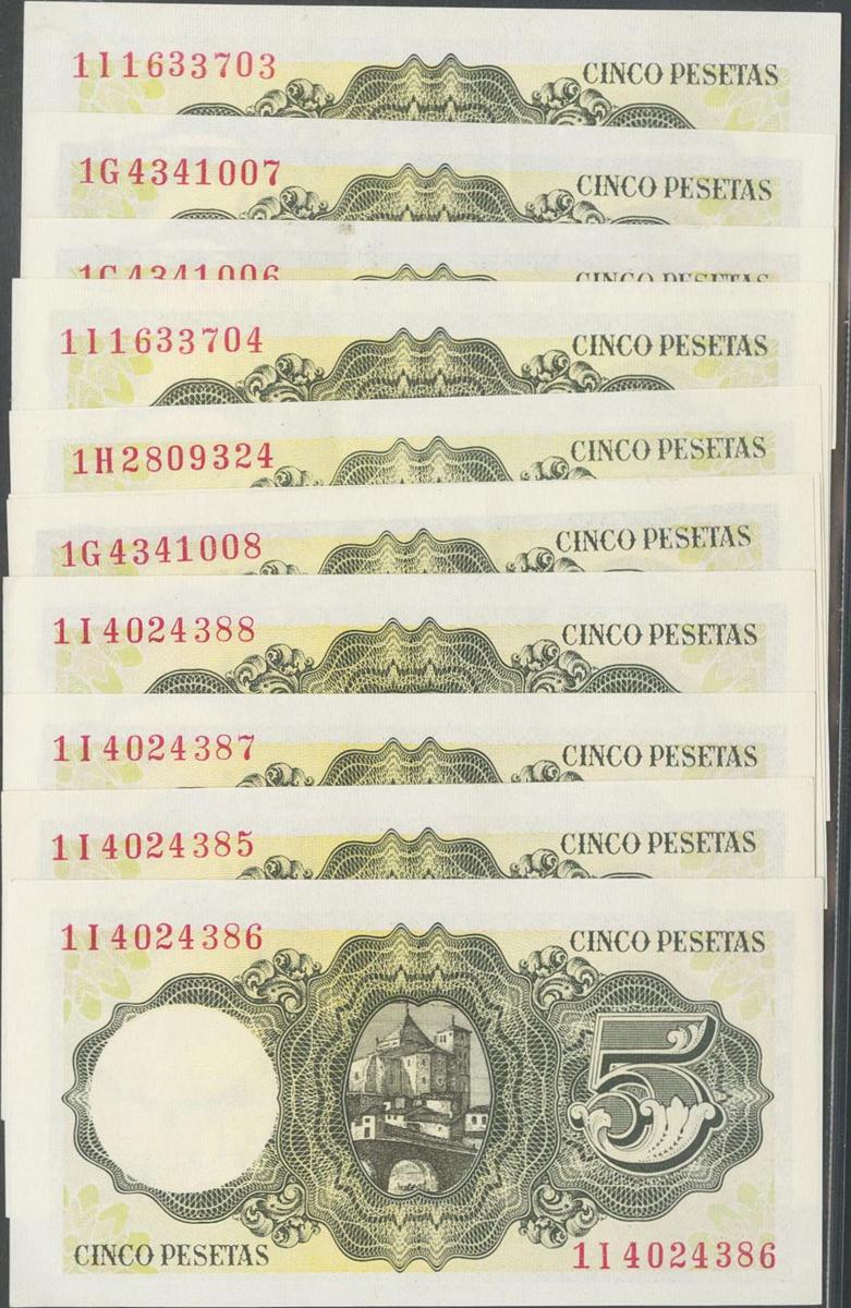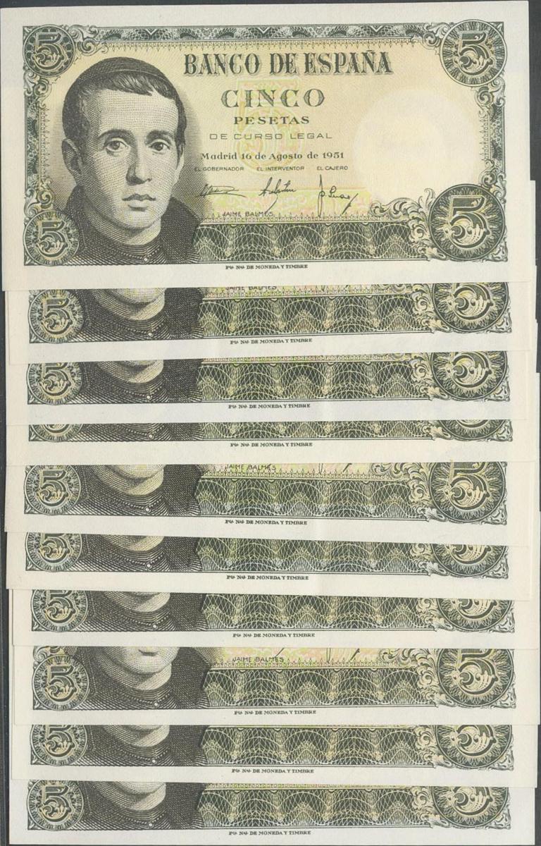 Conjunto de 11 billetes (algunos de ellos correlativos) de 5 Pesetas emitidos el 16 de Agosto de 1951, y con las series 1G, 1H y 1I. (Edifil 2021: 459a). Apresto original. SC/EBC+.
