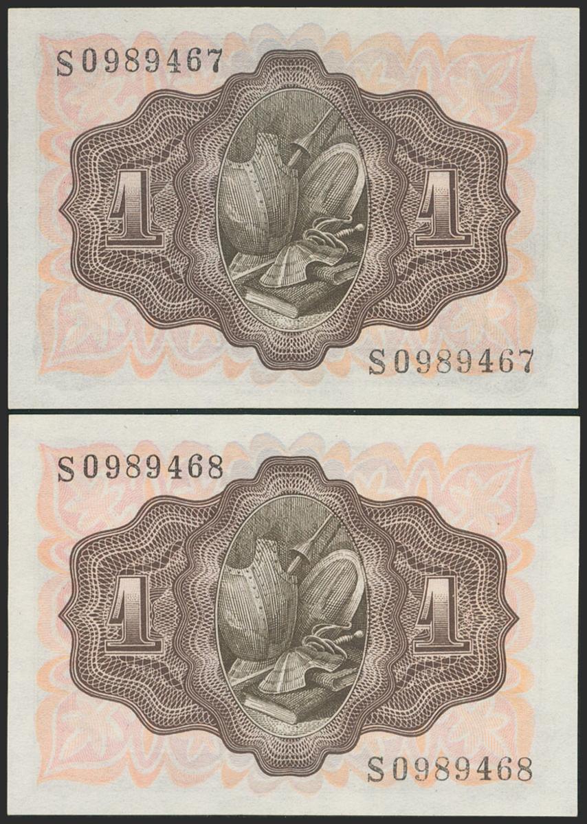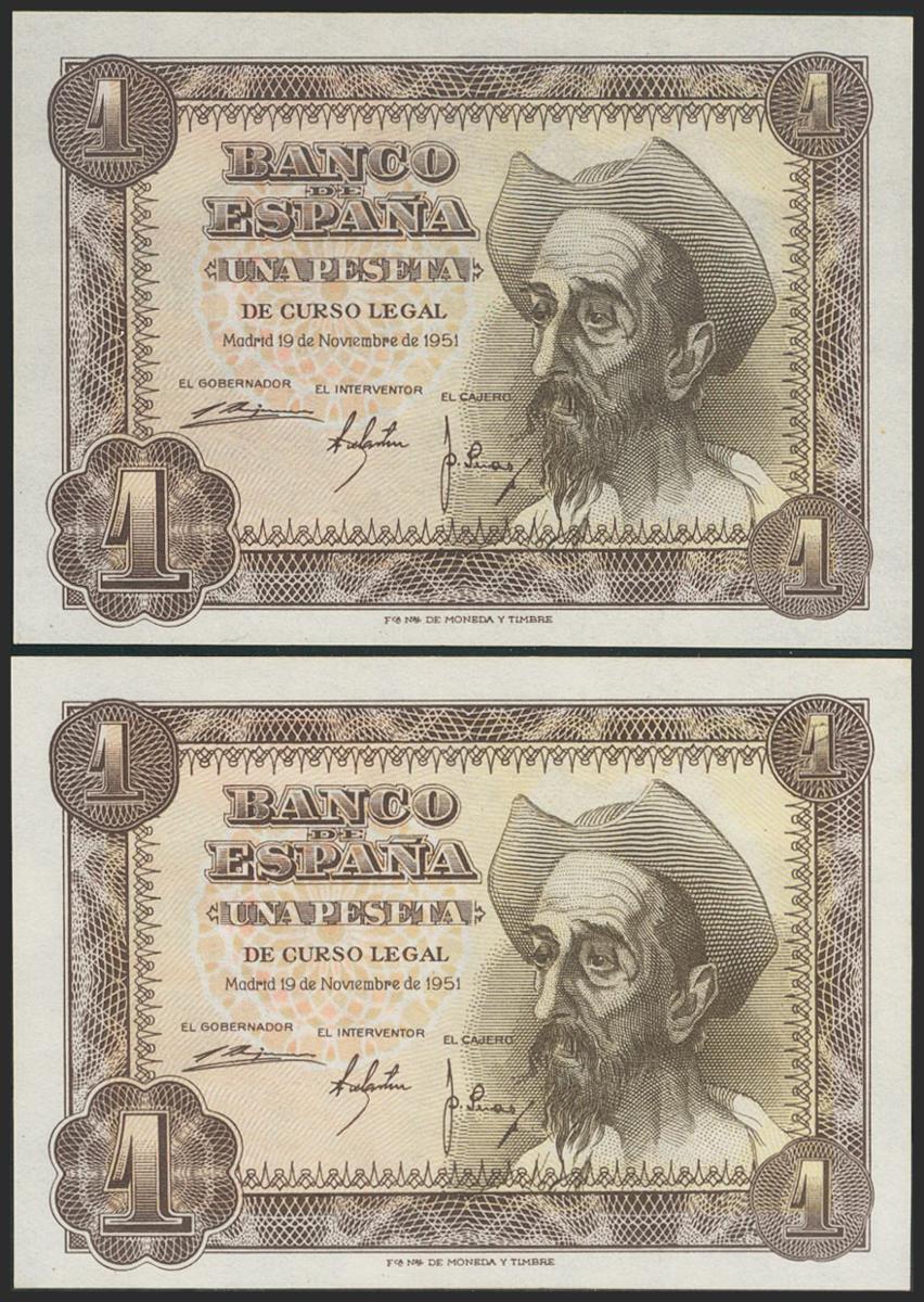 1 Peseta. 19 de Noviembre de 1951. Pareja correlativa. Serie S. (Edifil 2021: 461a). Apresto original. SC.