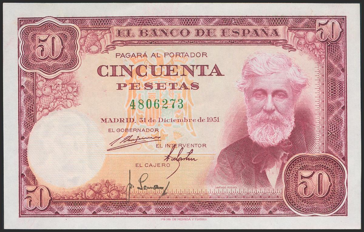 50 Pesetas. 31 de Diciembre de 1951. Sin serie. (Edifil 2021: 462). Apresto original. SC--.