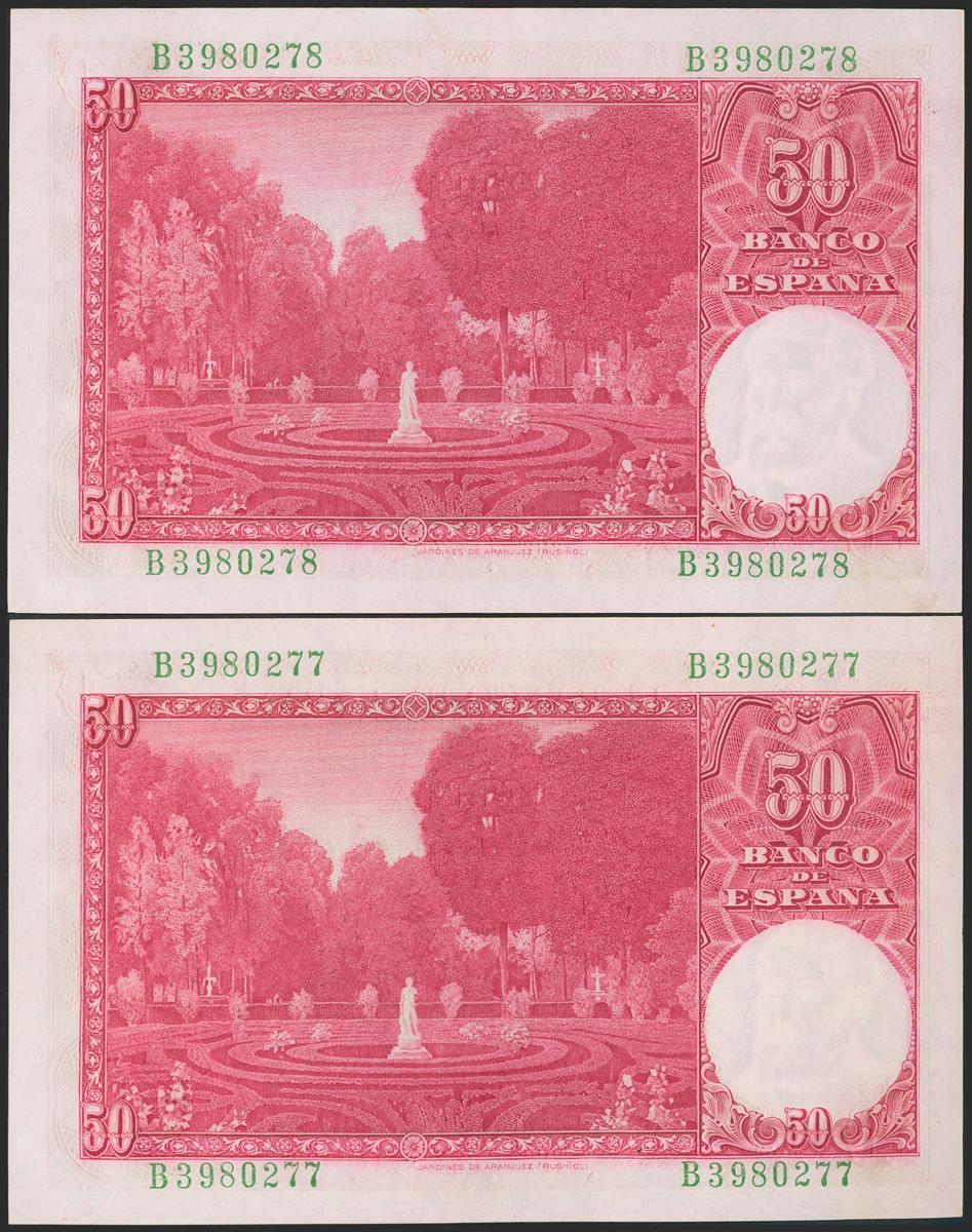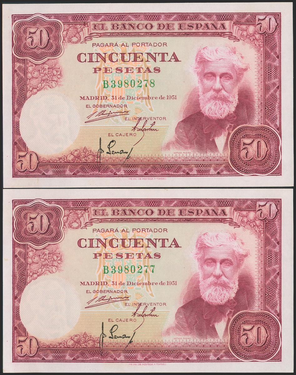 50 Pesetas. 31 de Diciembre de 1951. Pareja correlativa. Serie B. (Edifil 2021: 462a). Conserva todo su apresto original. SC.