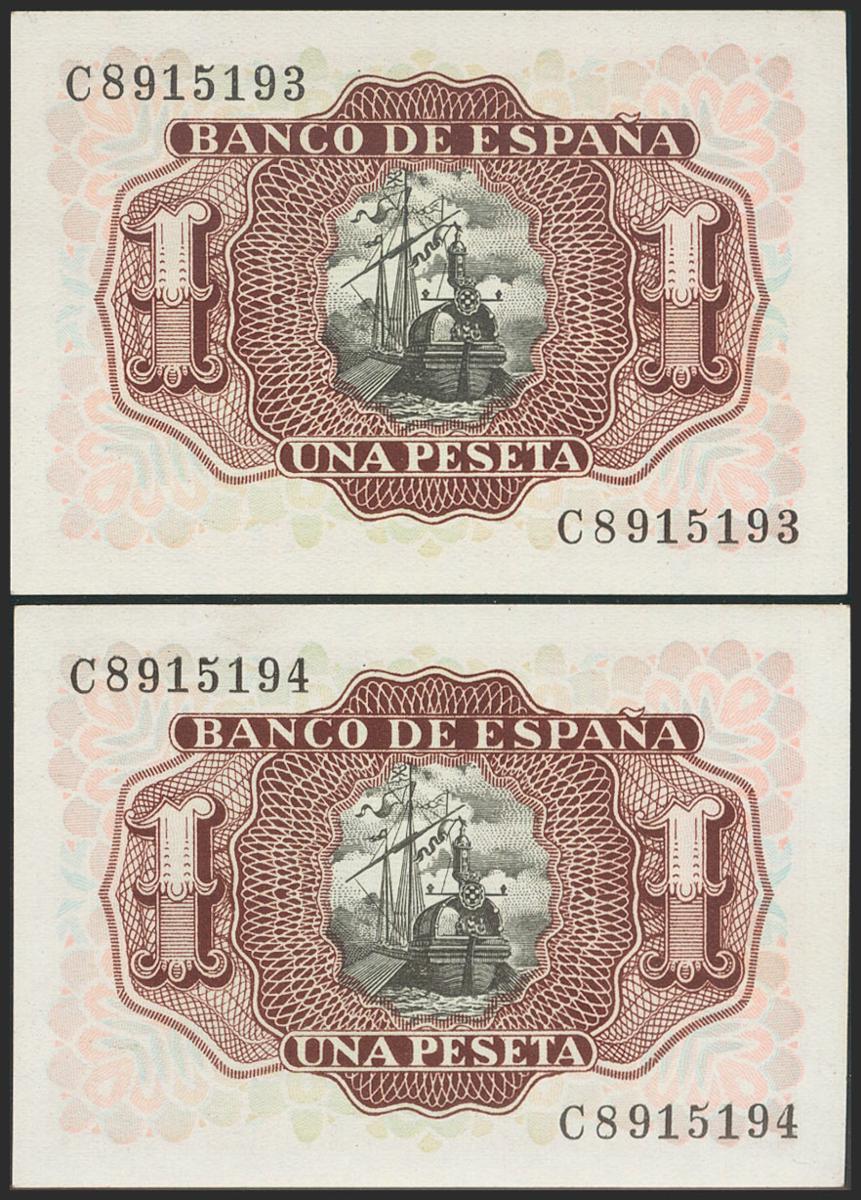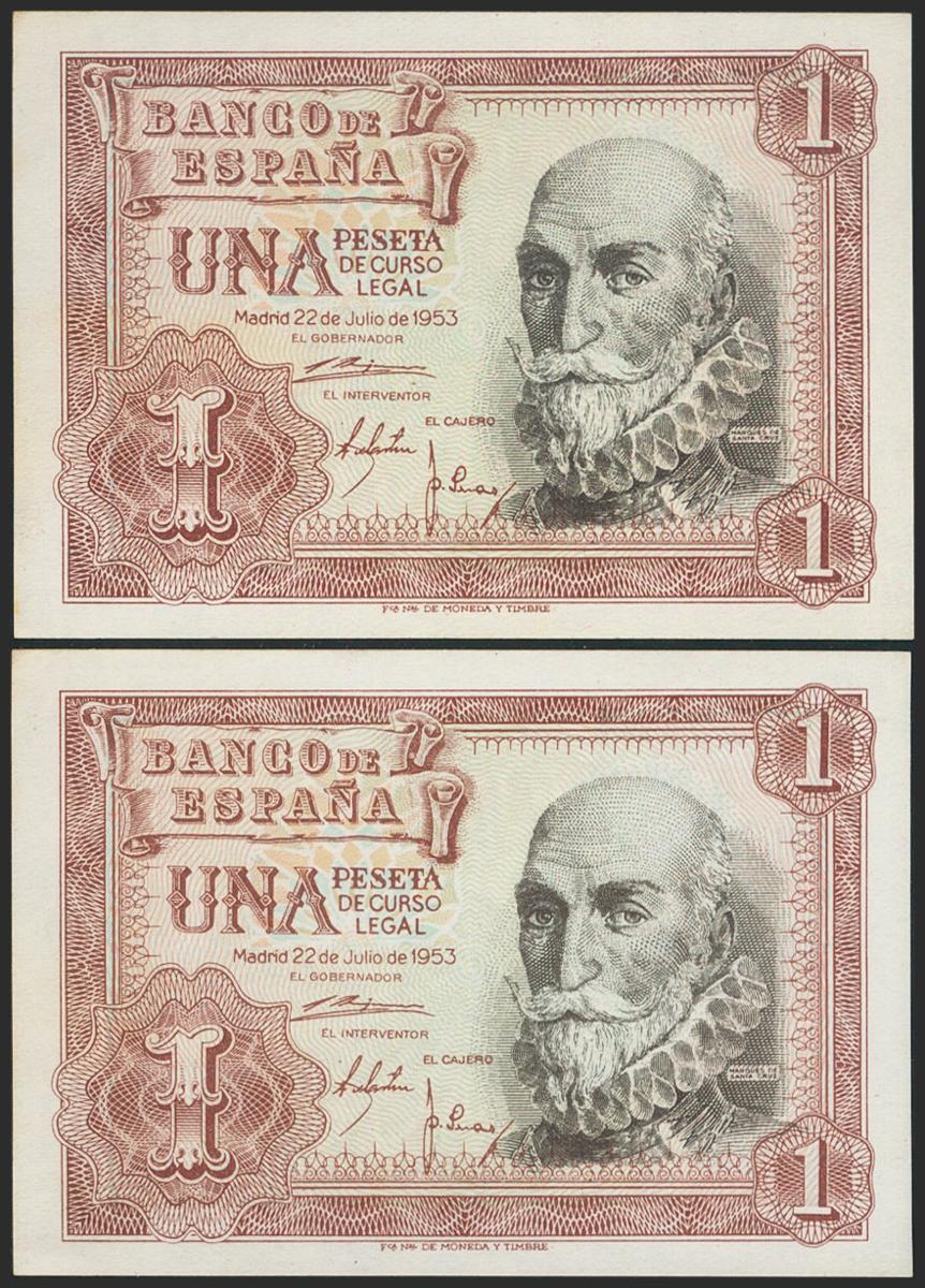 1 Peseta. 22 de Julio de 1953. Pareja correlativa. Serie C. (Edifil 2021: 465a). Apresto original. SC.