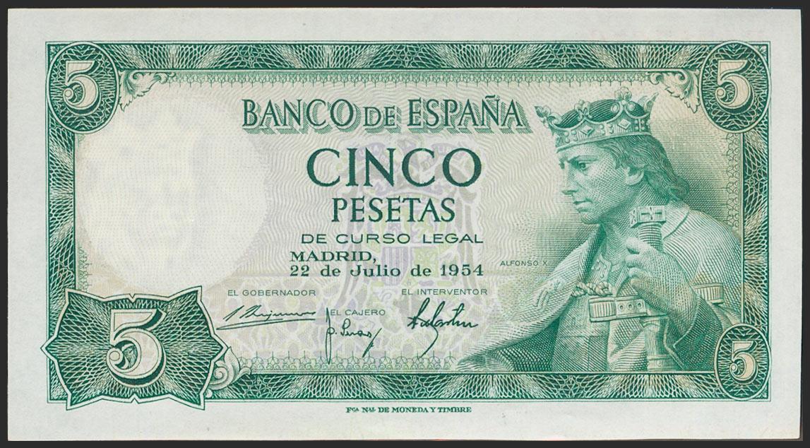 5 Pesetas. 22 de Julio de 1954. Serie E. (Edifil 2021: 466a). Apresto original. SC-.