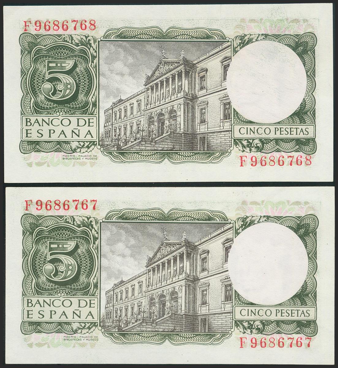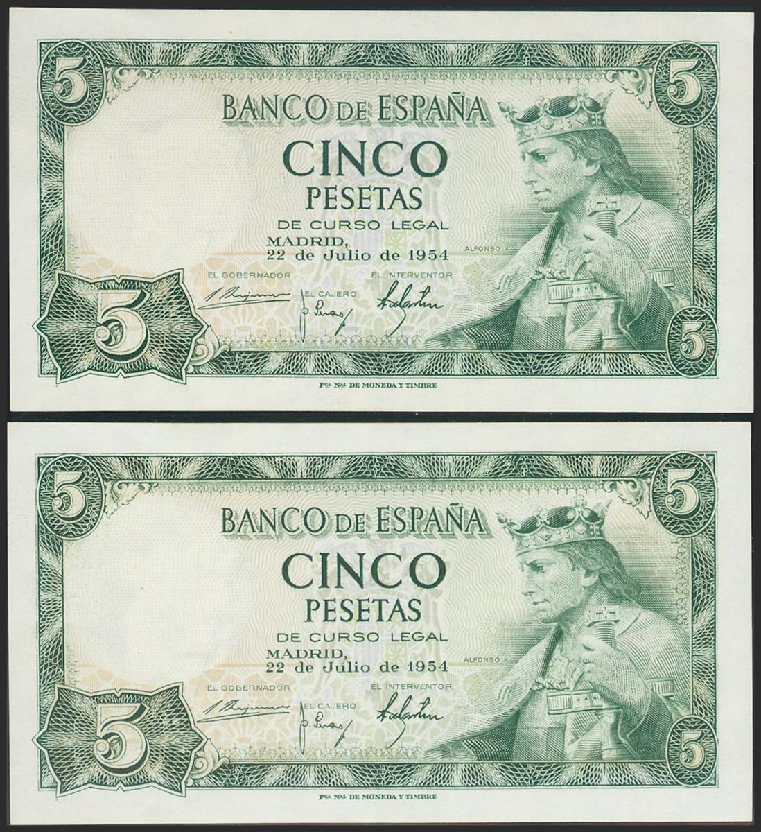 5 Pesetas. 22 de Julio de 1954. Pareja correlativa. Serie F. (Edifil 2021: 466a). Apresto original. SC-.