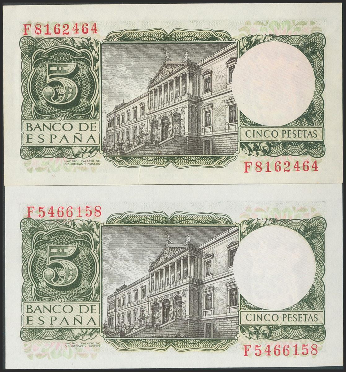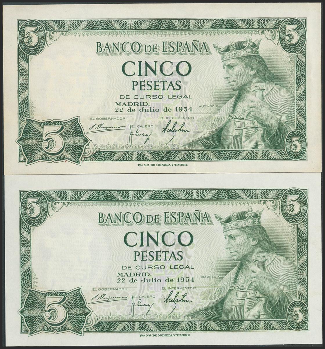 Conjunto de 2 billetes de 5 Pesetas emitidos el 22 de Julio de 1954 y ambos con la serie F. (Edifil 2017: 466a). Apresto original. SC/EBC.