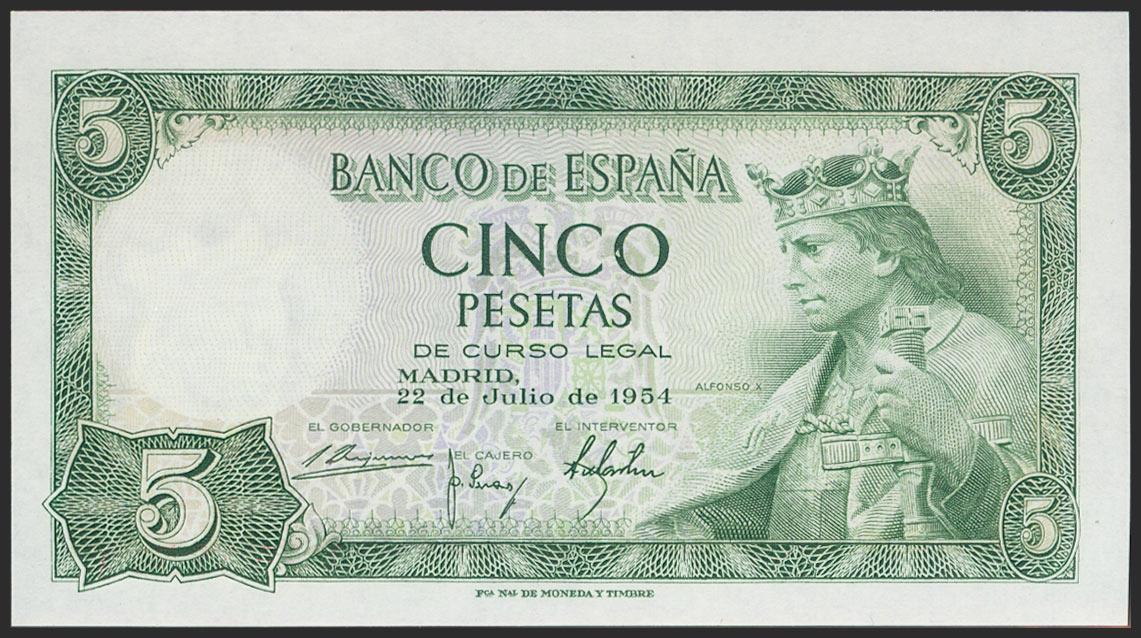 5 Pesetas. 22 de Julio de 1954. Serie V. (Edifil 2021: 466a). Apresto original. SC.