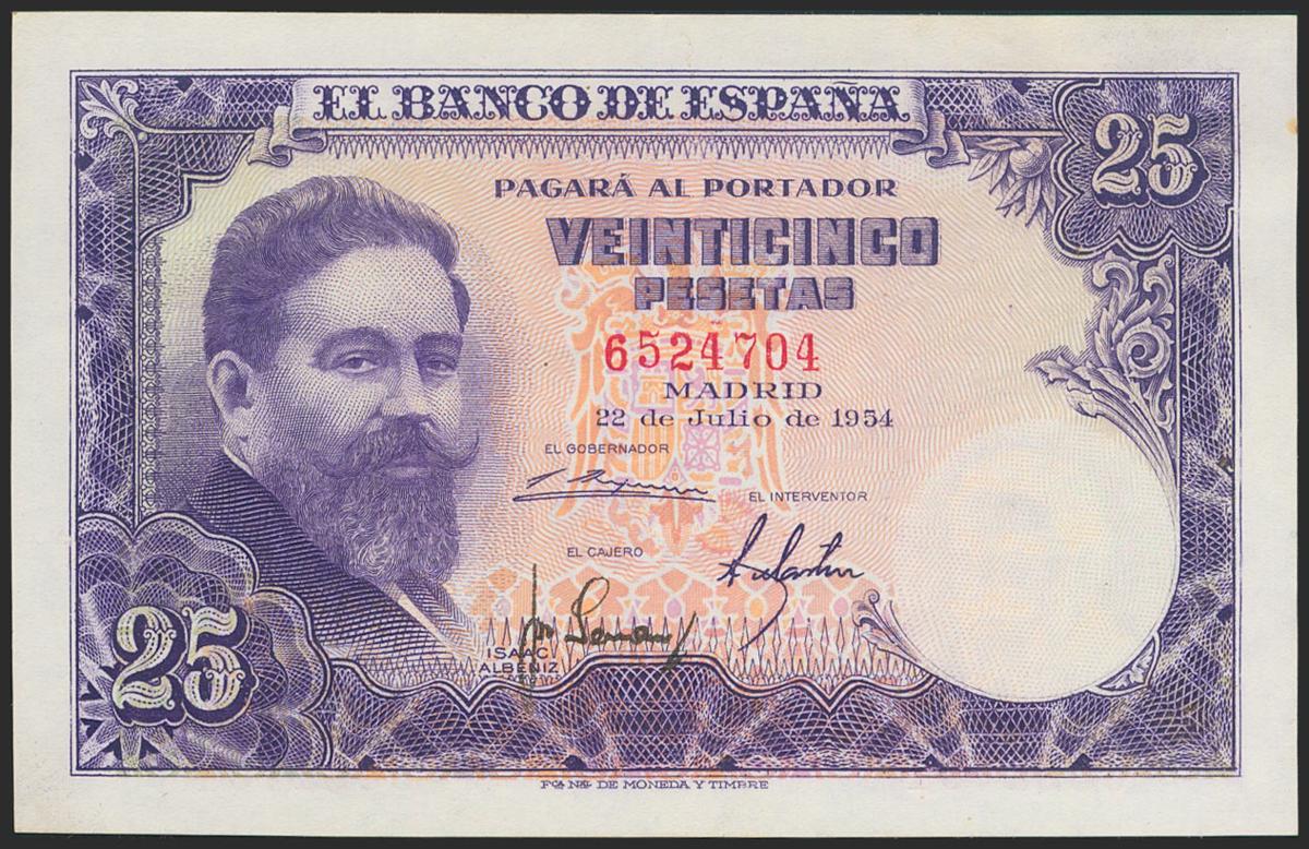 25 Pesetas. 22 de Julio de 1954. Sin serie. (Edifil 2021: 467). Conserva gran parte del apresto original. EBC.