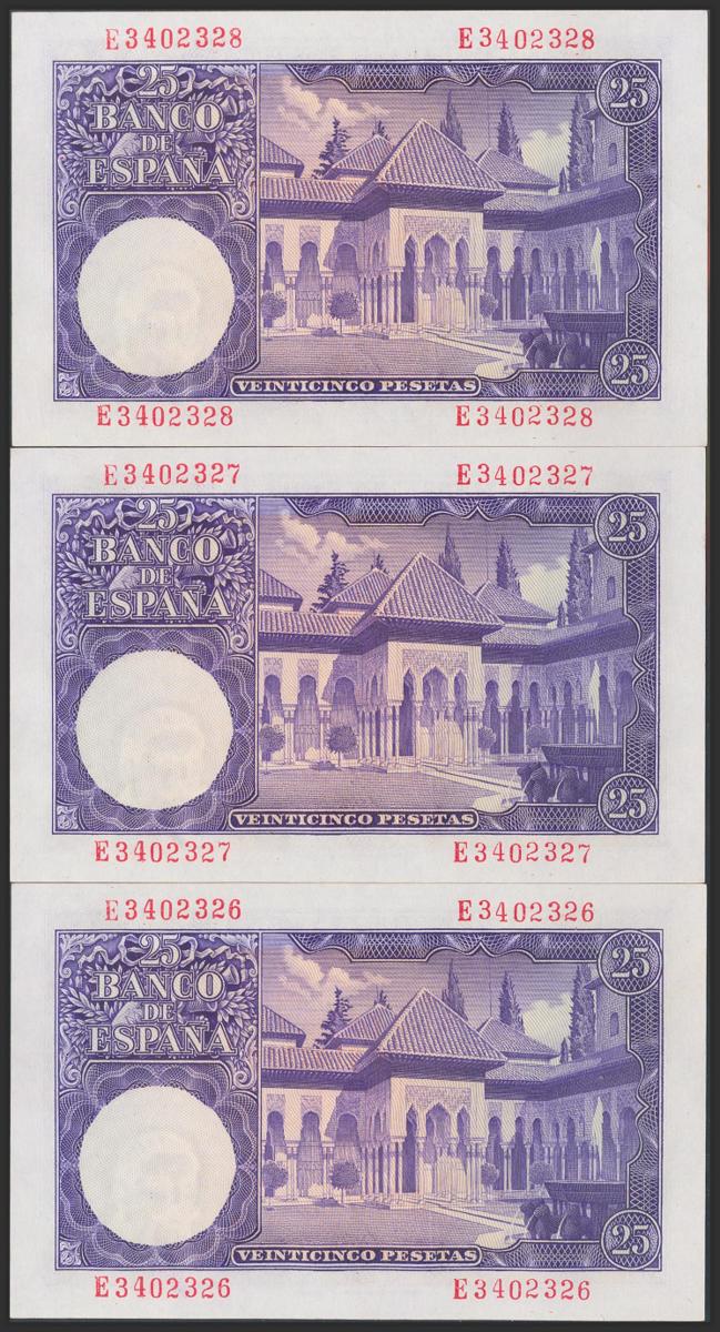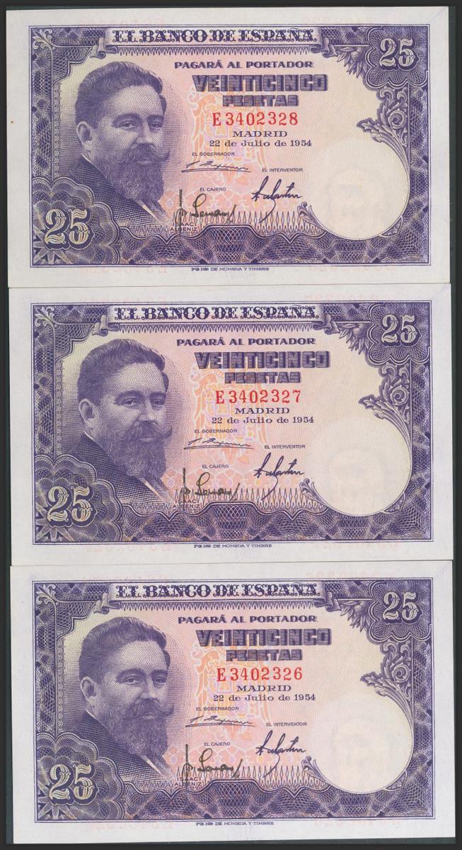 25 Pesetas. 22 de Julio de 1954. Trío correlativo. Serie E. (Edifil 2017: 467a). Conserva todo su apresto original. SC/SC-.