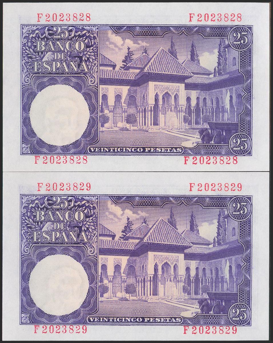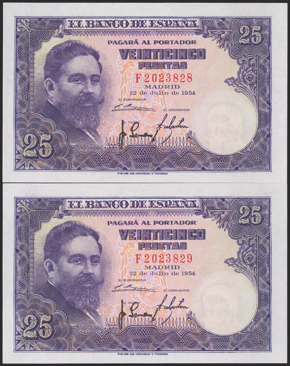 25 Pesetas. 22 de Julio de 1954. Pareja correlativa. Serie F. (Edifil 2021: 467a). Apresto original. SC.