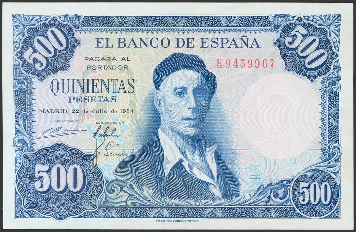 500 Pesetas. 22 de Julio de 1954. Serie K. (Edifil 2017: 468b). Conserva todo su apresto original. SC-.