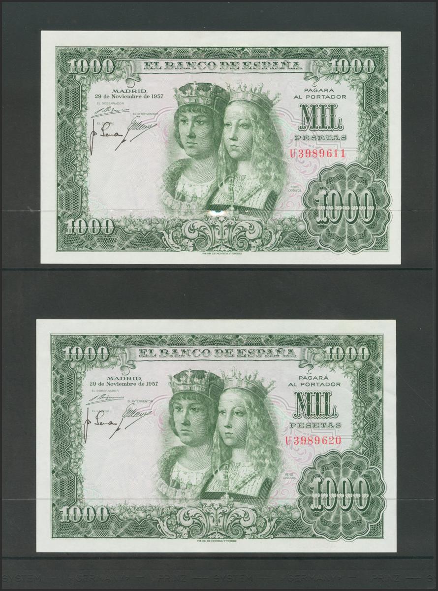 Conjunto de 9 billetes de 1000 Pesetas del Banco de España y emitidos el 29 de Noviembre de 1957, todos con numeraciones muy próximas e incluso una pareja correlativa, todos con la Serie U. (Edifil 2017: 469b). Conservan todo su apresto original. SC/SC-/EBC+. (la inmensa mayoría ebc+, uno presenta alguna manchita provocada por una goma elástica)