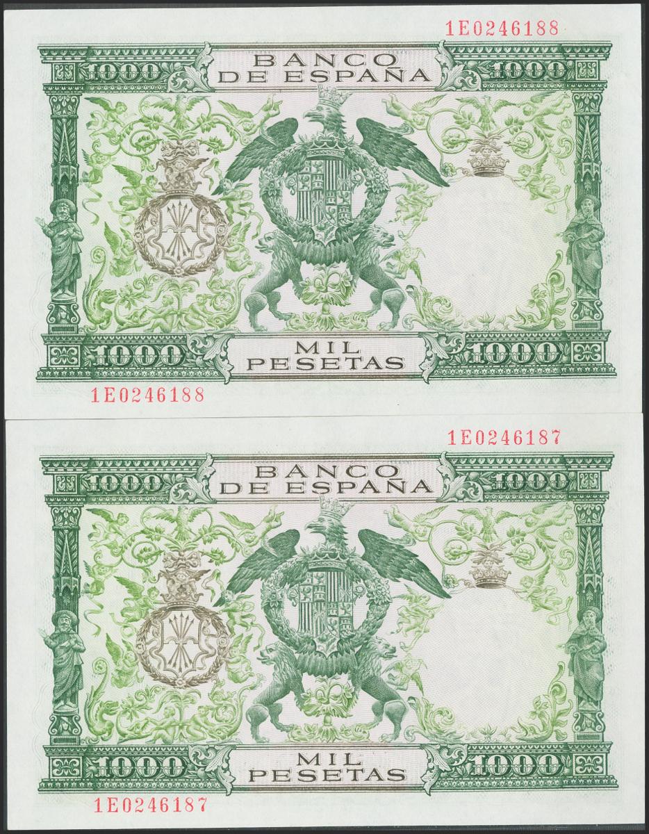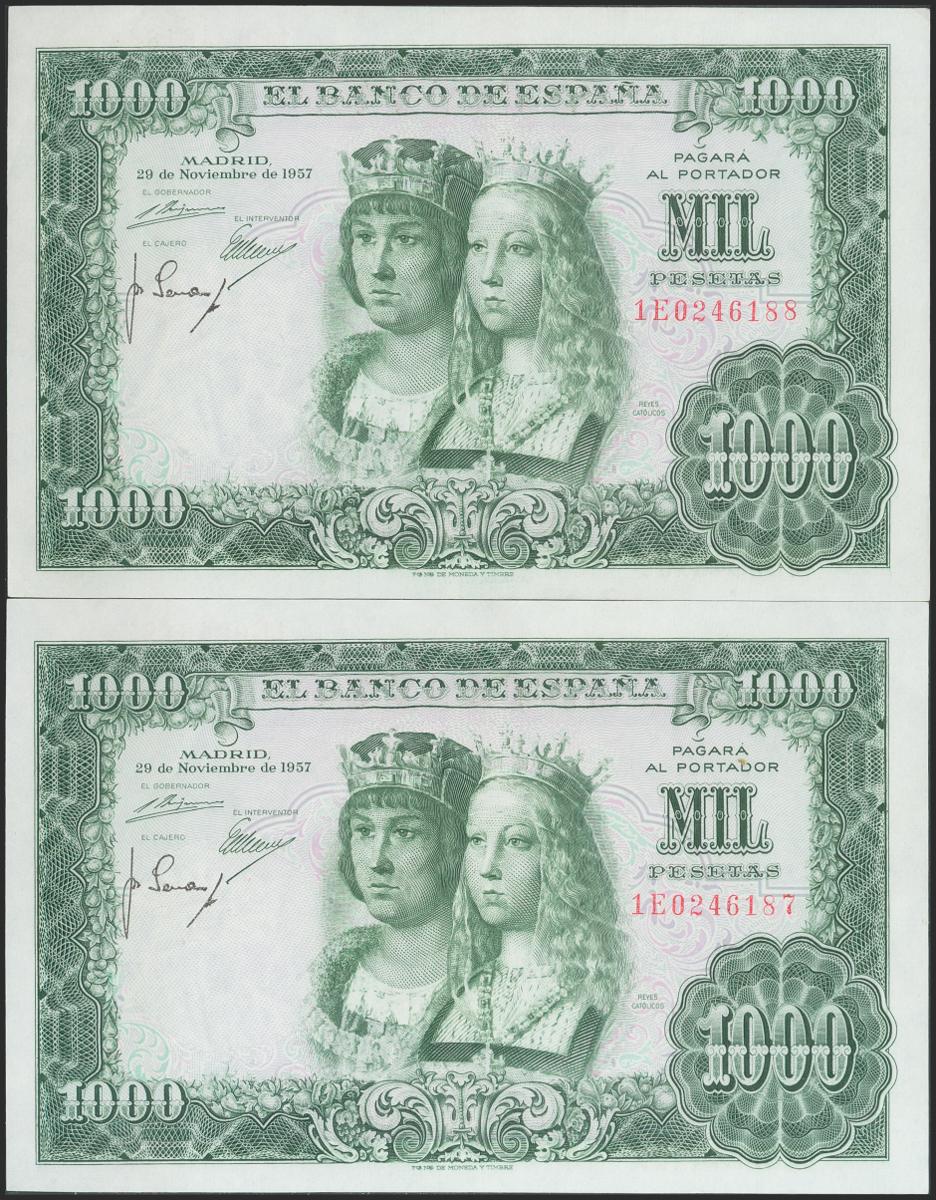 1000 Pesetas. 29 de Noviembre de 1957. Pareja correlativa. Serie 1E. (Edifil 2021: 469b). Apresto original. SC/SC-.