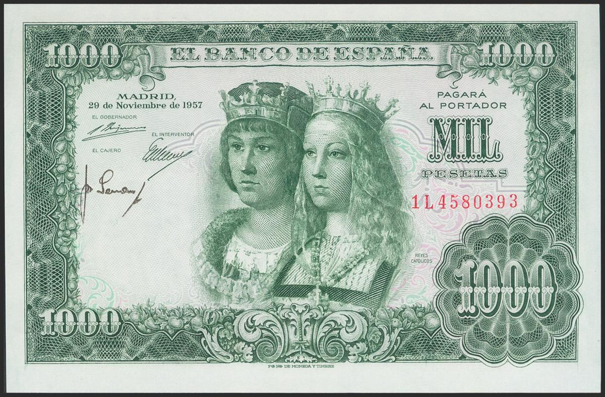 1000 Pesetas. 29 de Noviembre de 1957. Serie 1L. (Edifil 2021: 469b). Conserva todo su apresto original. SC.