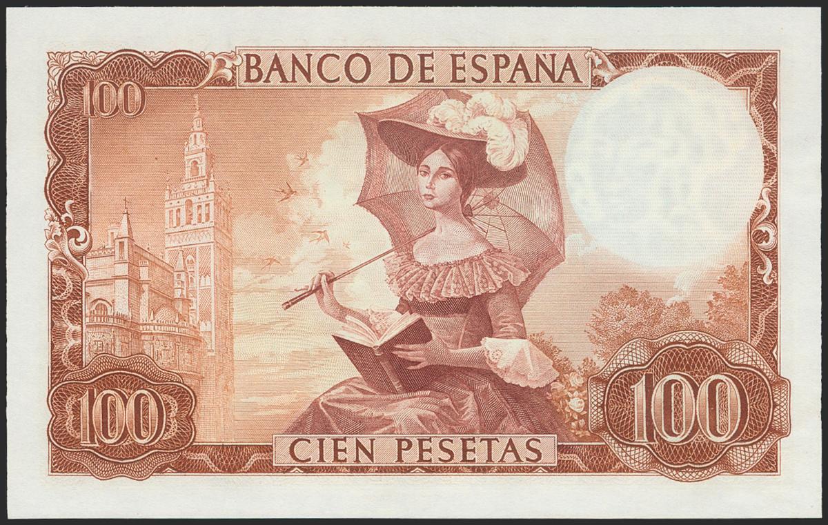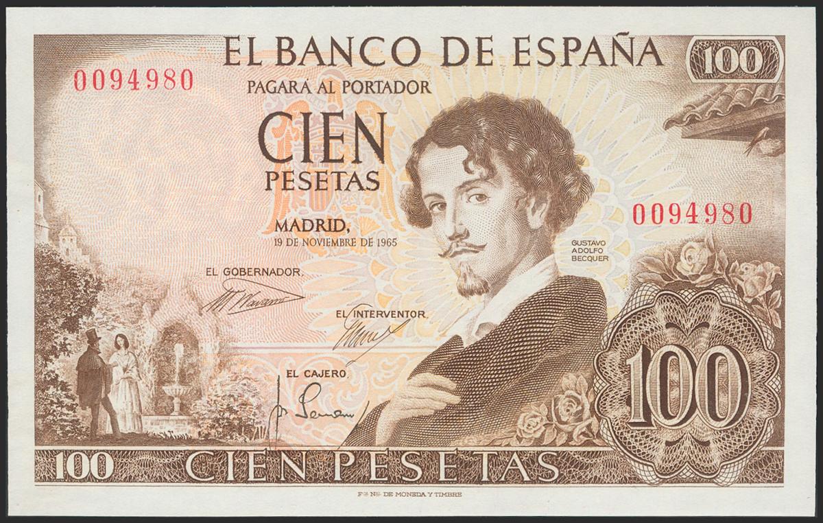100 Pesetas. 19 de Noviembre de 1965. Sin serie y numeración muy baja. (Edifil 2017: 470). Apresto original. SC.