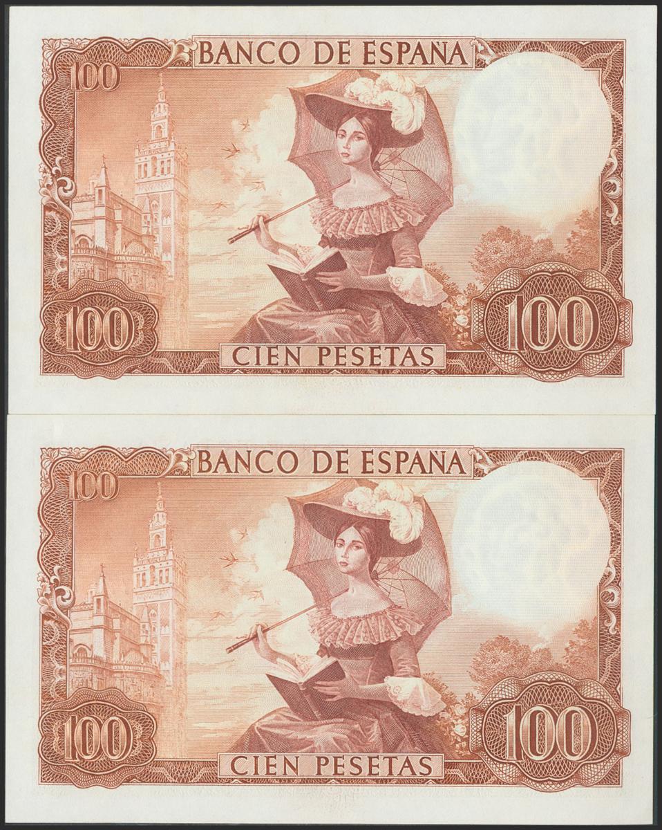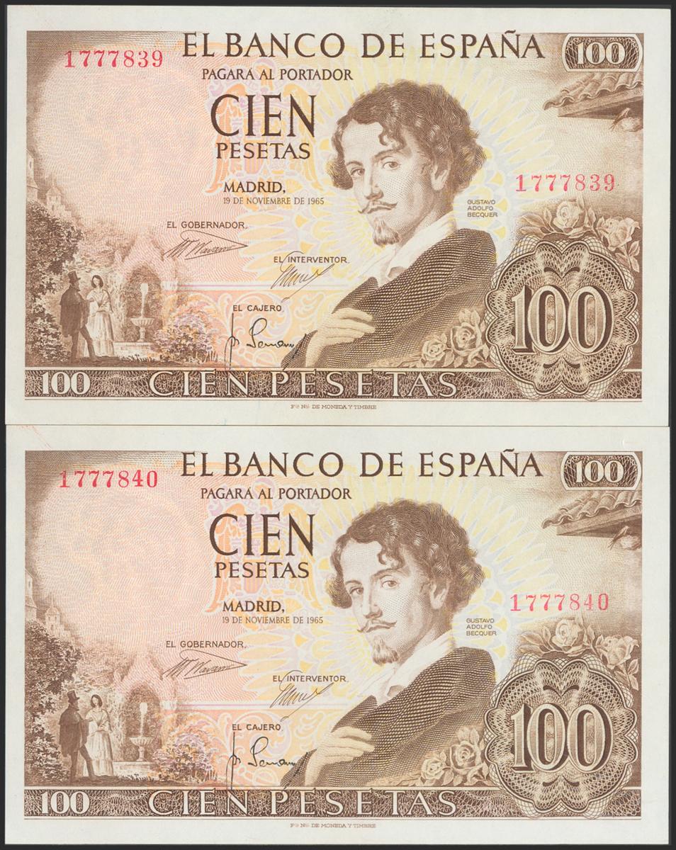 100 Pesetas. 19 de Noviembre de 1965. Pareja correlativa. Sin serie. (Edifil 2017: 470). Apresto original. SC.