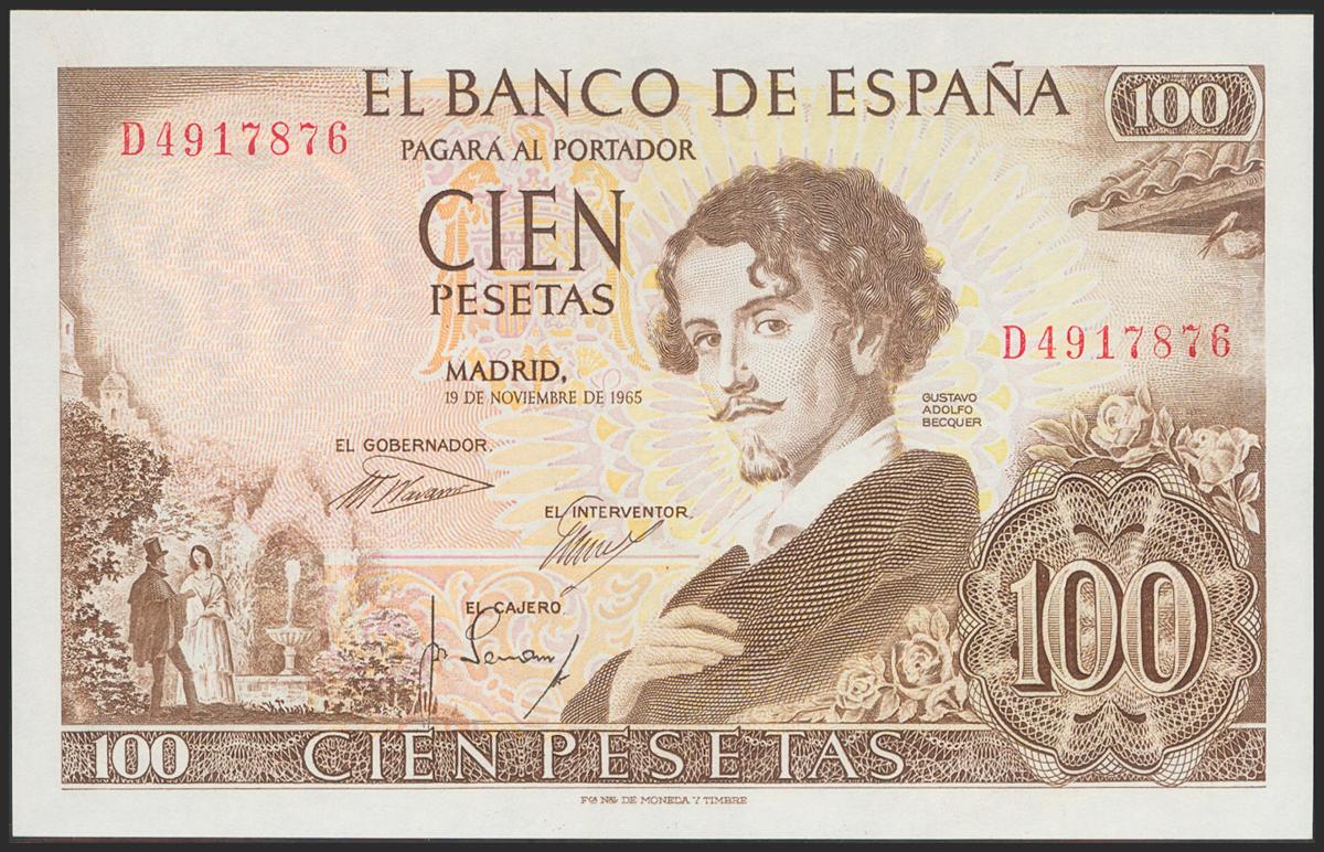 100 Pesetas. 19 de Noviembre de 1965. Serie D. (Edifil 2021: 470a). Apresto original. SC-.