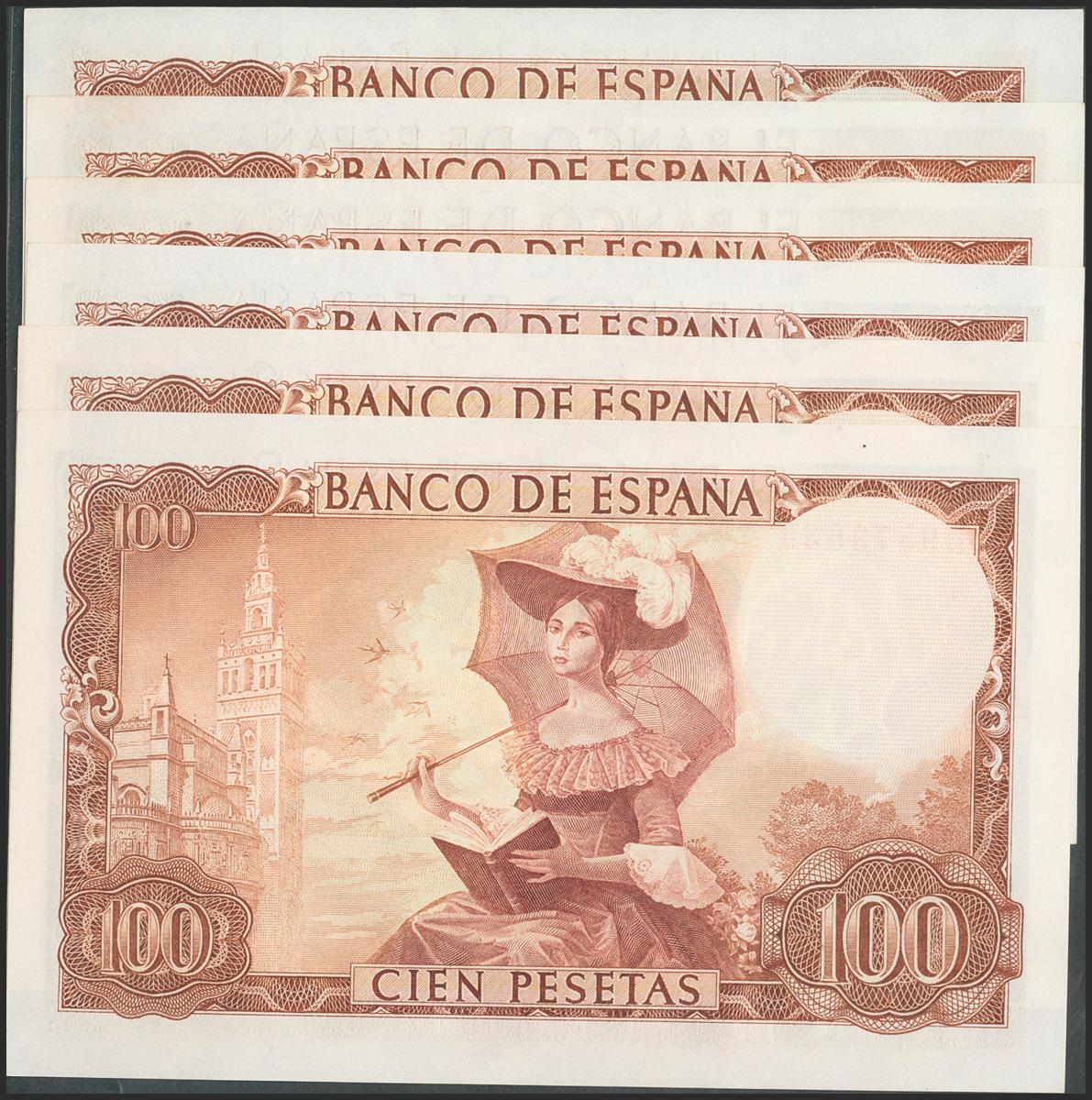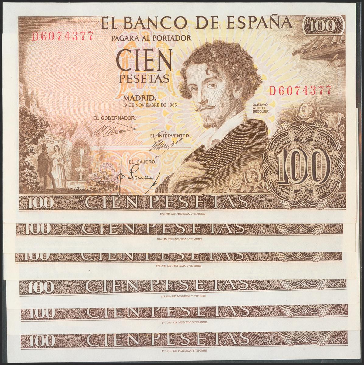 Conjunto de 6 billetes de 100 Pesetas emitidos el 19 de Noviembre de 1965, con las serie D(3), I(1) y 1D(2) (Edifil 2017: 470a). SC/SC-.