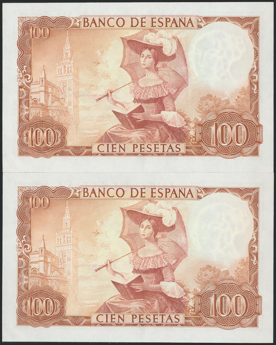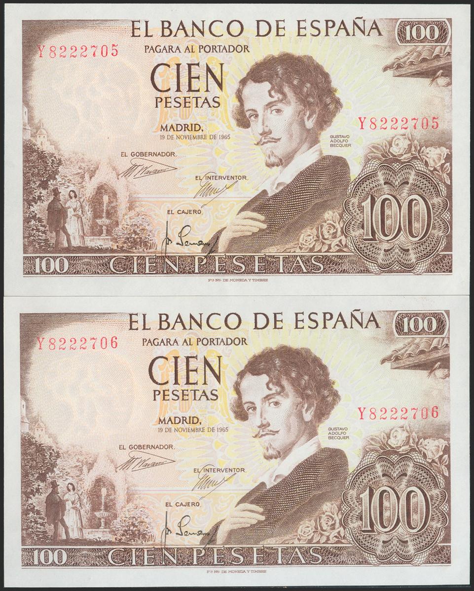 100 Pesetas. 19 de Noviembre de 1965. Pareja correlativa. Serie Y. (Edifil 2021: 470a). Conserva gran parte de su apresto original. EBC+.