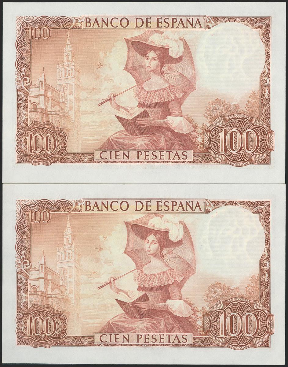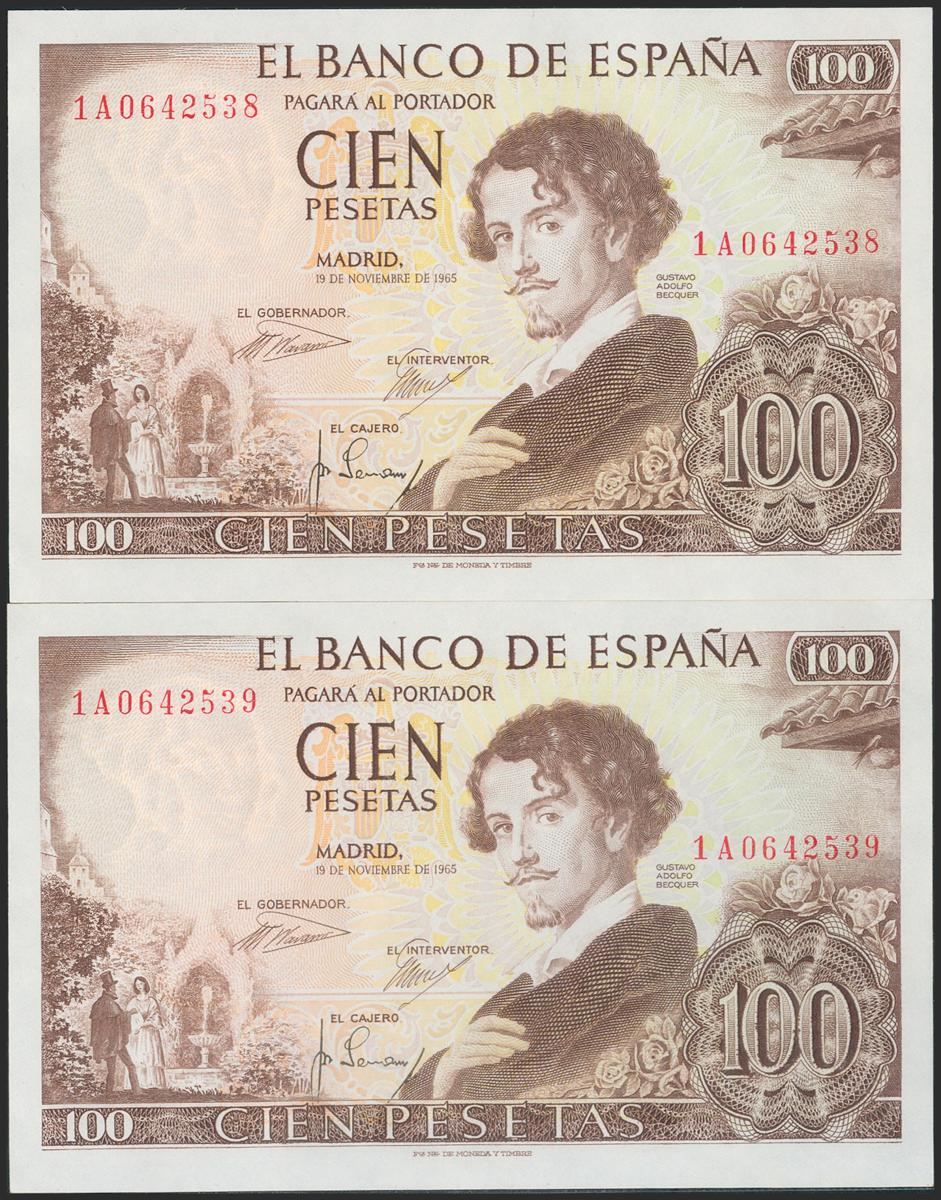 100 Pesetas. 19 de Noviembre de 1965. Pareja correlativa. Serie 1A. (Edifil 2021: 470a). Conserva parte de su apresto original. SC.