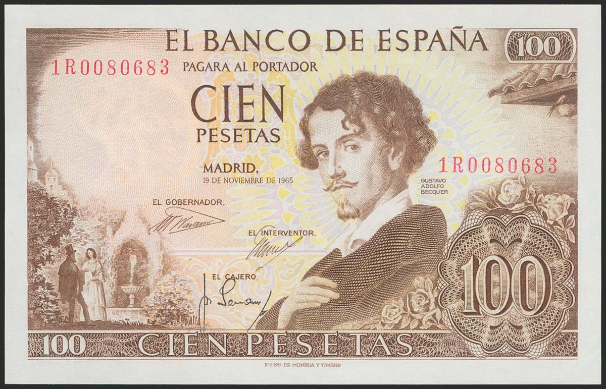 100 Pesetas. 19 de Noviembre de 1965. Serie 1R. (Edifil 2021: 470a). Apresto original. SC.