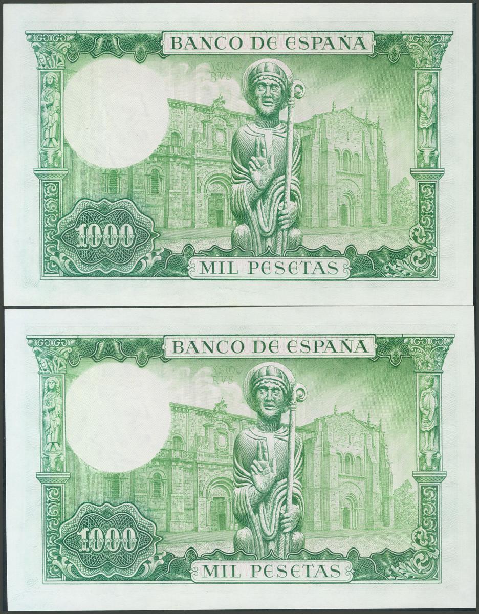 1000 Pesetas. 19 de Noviembre de 1965. Pareja correlativa. Serie B. (Edifil 2017: 471b). Apresto original. EBC+.