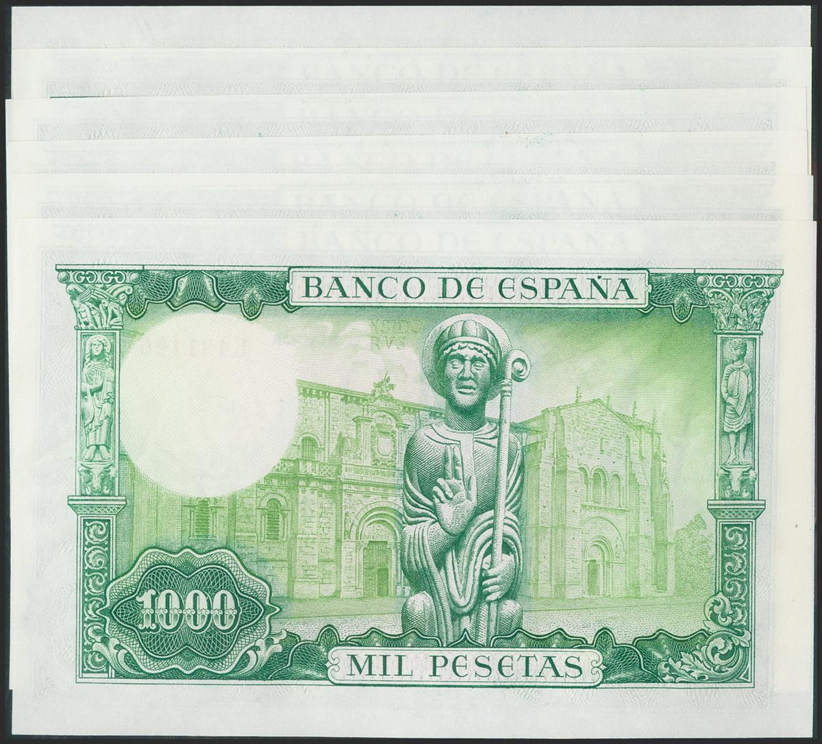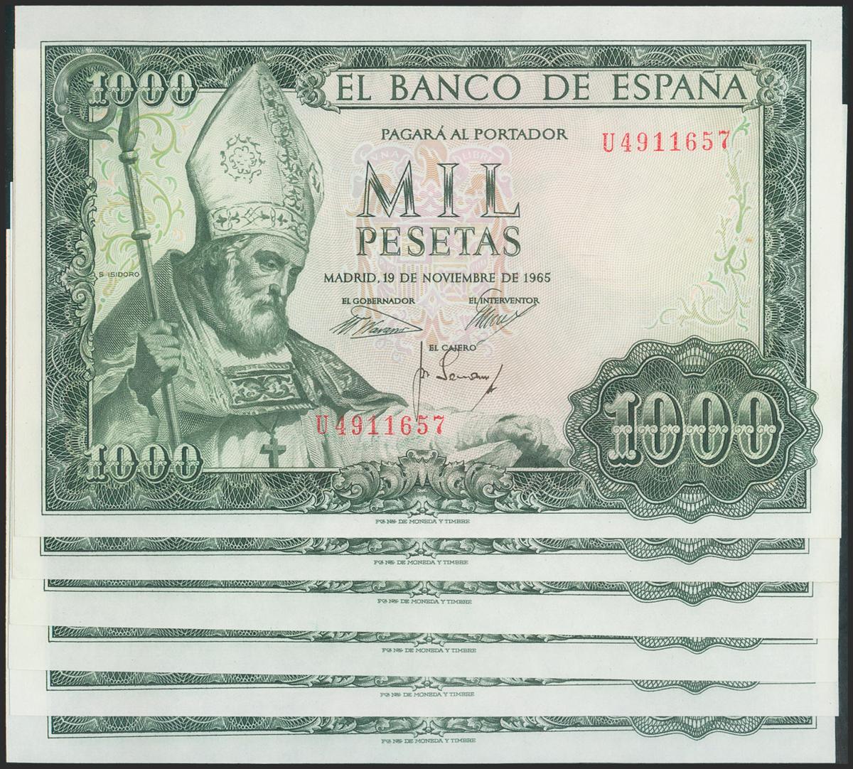 Conjunto de 6 billetes (en tramos correlativos) de 1000 Pesetas emitidos el 19 de Noviembre de 1965, todos con la serie U. (Edifil 2021: 471b). Apresto original. SC-.