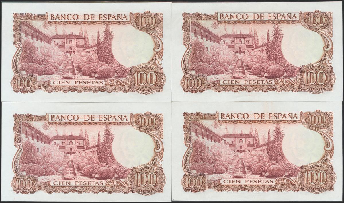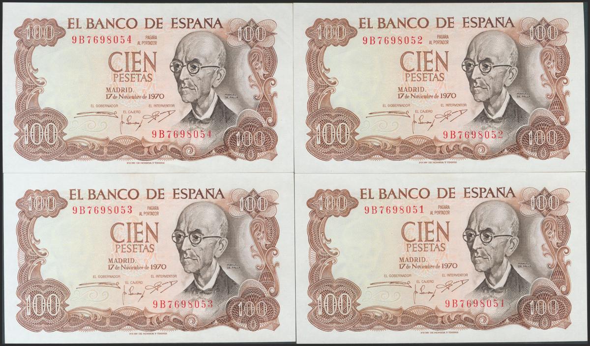 Conjunto de 4 billetes correlativos de 100 Pesetas emitidos el 17 de Noviembre de 1970 y con la serie especial 9B. (Pick: 152, Edifil: 472). Apresto original. SC-/SC, excepto un EBC+.