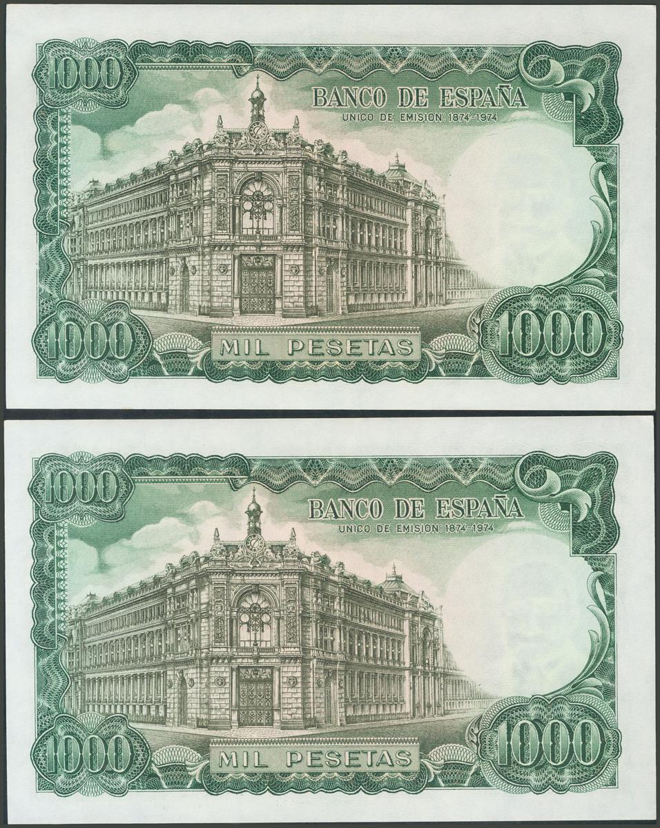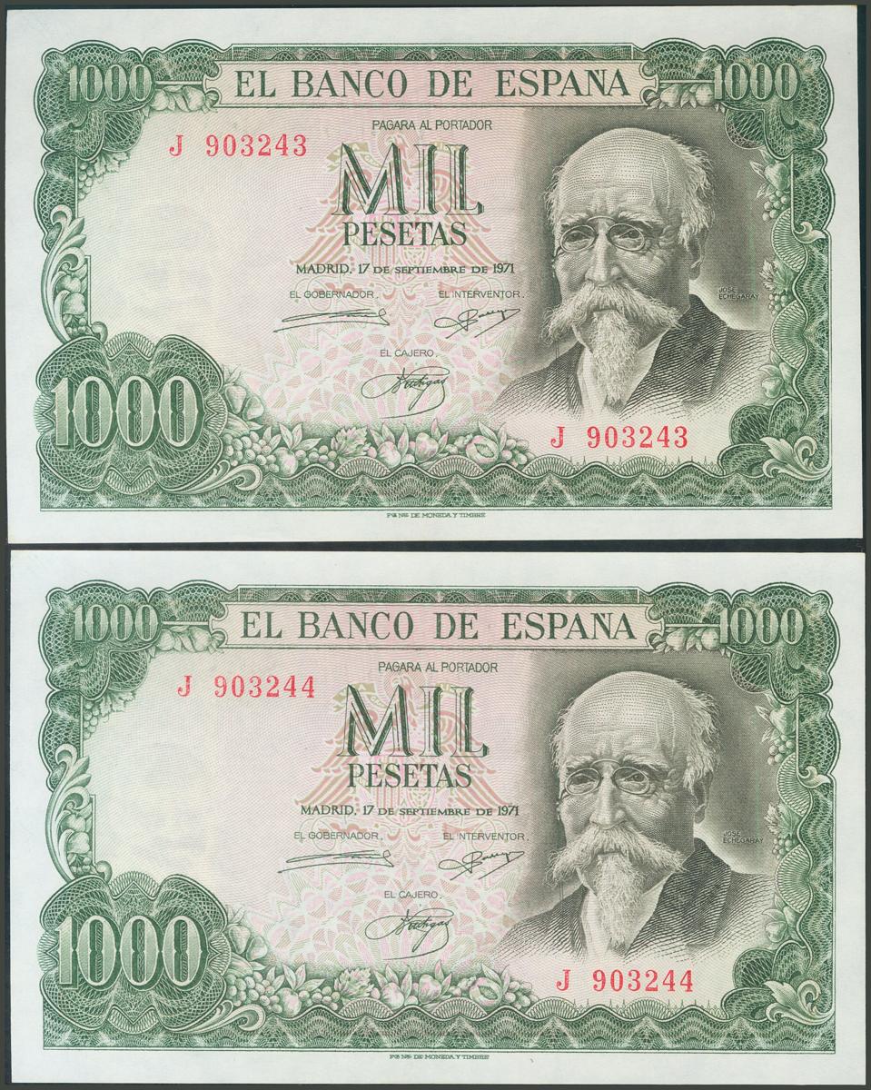 1000 Pesetas. 17 de Septiembre de 1971. Pareja correlativa. Serie J. (Edifil 2017: 474b). Apresto original. EBC+.