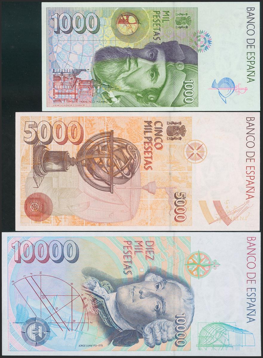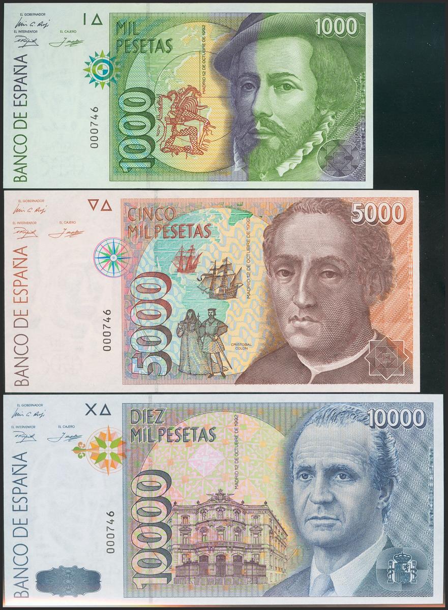 Conjunto de 3 billetes de 1000 Pesetas, 5000 Pesetas y 10000 Pesetas emitidos el 12 de Octubre de 1992. Sin serie y con la misma numeración muy baja 000746. (Edifil 2021: 483, 484, 485). Muy raro conjunto. SC.
